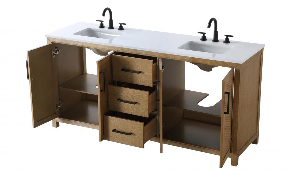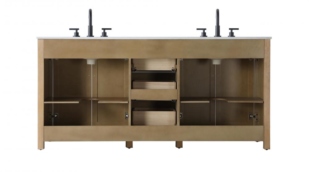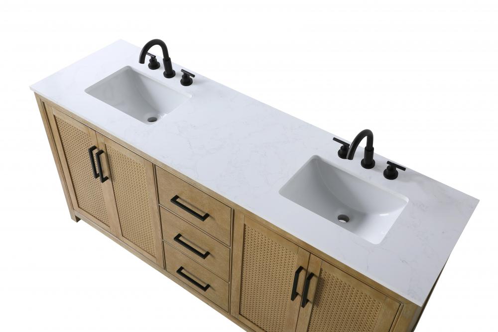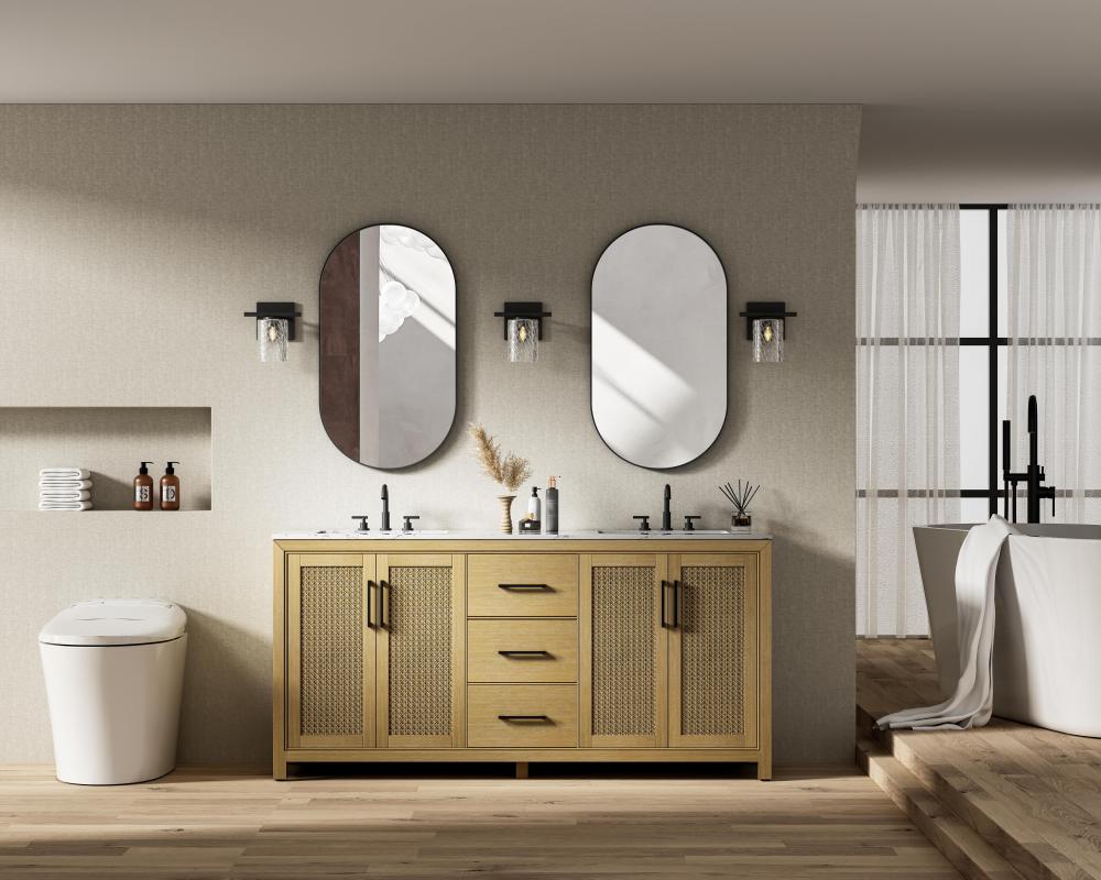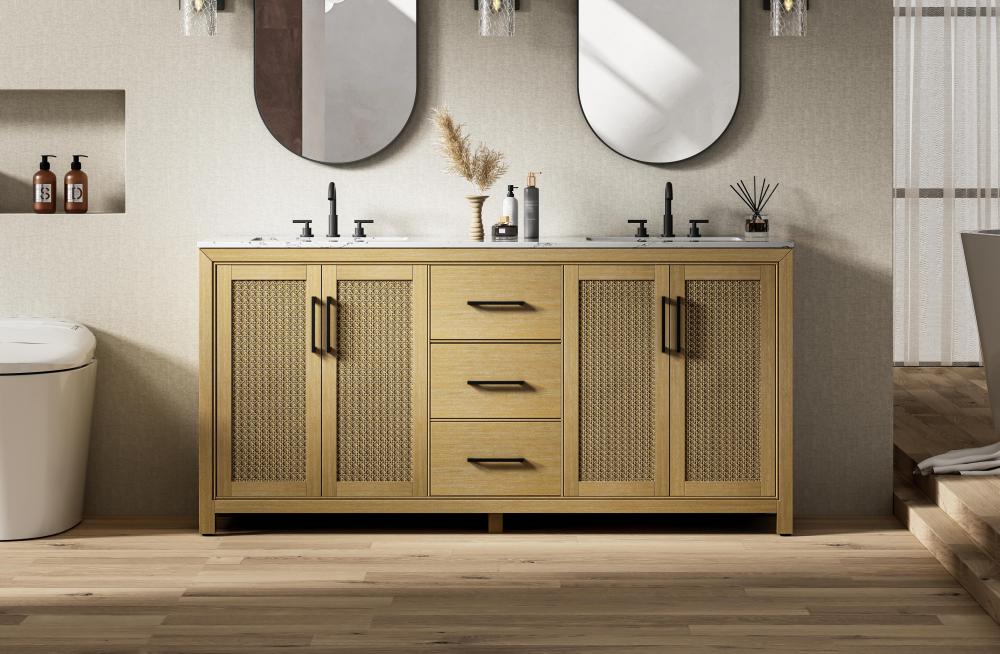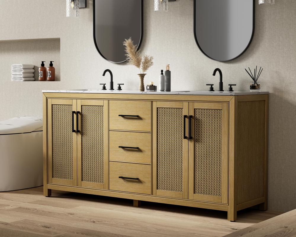 Perfect for those with an eye for detail and quality, this transitional vanity blends modern design with timeless elegance. Available in five stunning finishes, from Crisp White to Linen Oak, the wood grain visuals of the oak options bring warmth and character to any bathroom. The caning design on the Shaker-style door panels adds texture and a touch of refinement, while the soft-closing doors and drawers ensure smooth, quiet functionality. Topped with a white engineered marble countertop, the vanity offers both luxury and practicality, complete with pre-drilled faucet holes for customization. A concealed overflow and U-shaped shelf for plumbing make installation effortless, and the slender black metal pulls provide a sleek contrast.