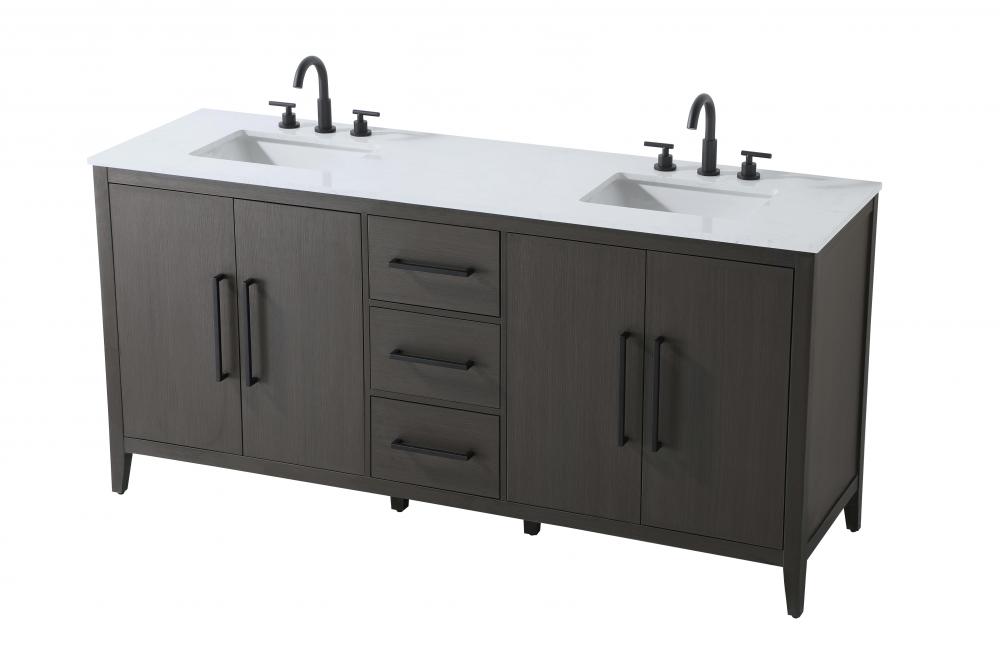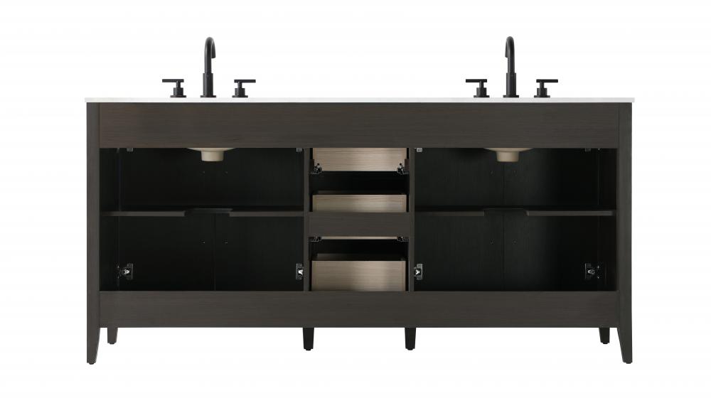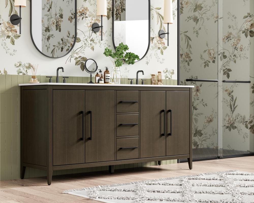 Bring both elegance and practicality to your bathroom with this transitional vanity, available in a selection of rich finishes that highlight the beauty of faux wood grain in shades of mocha, chestnut, and honey, along with classic white and modern grey. The flat door panels and sleek black metal pulls create a minimalist yet refined aesthetic, while the soft-closing drawers and tapered legs with levelers provide smooth, functional operation. Topped with a luxurious white engineered marble countertop and featuring a porcelain sink, this vanity combines timeless style with modern efficiency. Thoughtfully designed with U-shaped cutout for plumbing, it offers ample storage and easy installation, making it the perfect centerpiece for any bathroom.