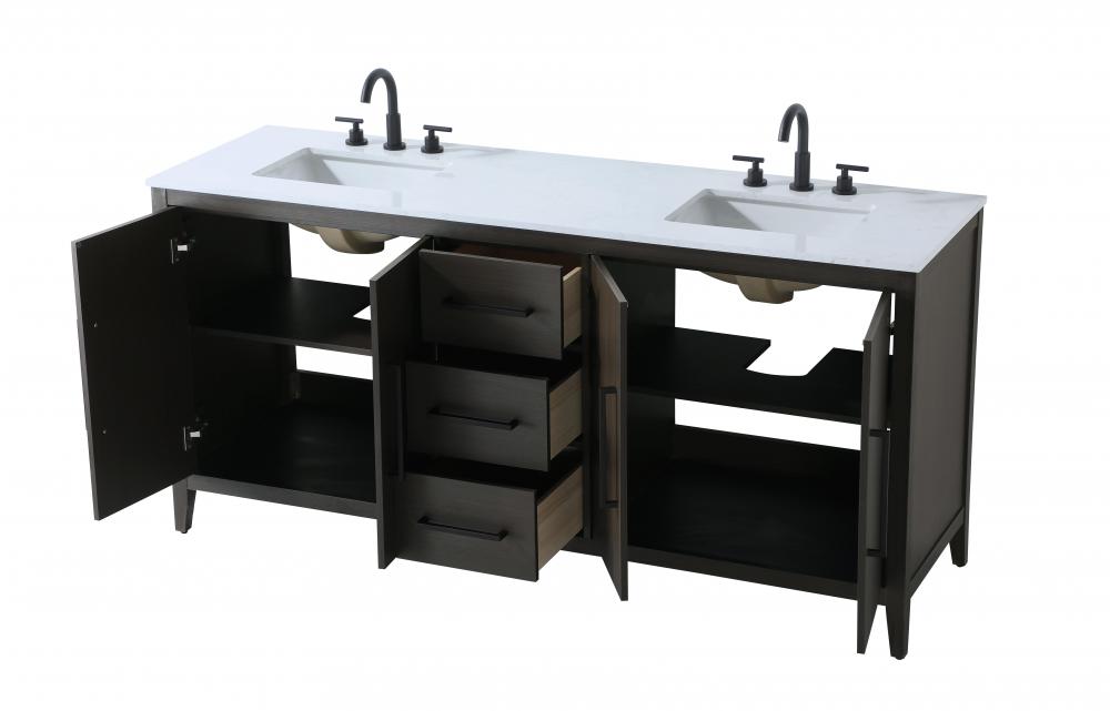 The vanity stands on tapered 5-inch solid wood legs with levelers for a balanced, polished look, combining modern style with practicality.