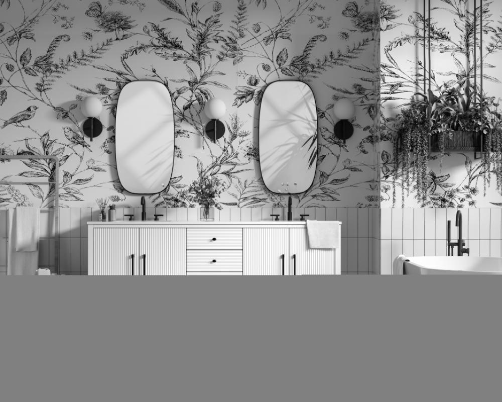The slender black metal pulls on the doors and the oval-shaped knobs on the drawers provide sleek, modern accents, enhancing the vanity's elegant design.