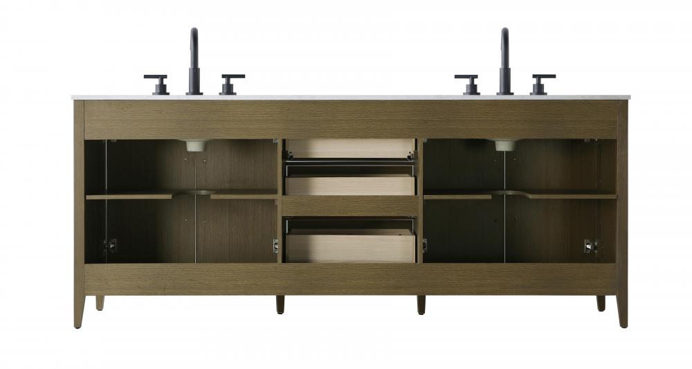 Bring both elegance and practicality to your bathroom with this transitional vanity, available in a selection of rich finishes that highlight the beauty of faux wood grain in shades of mocha, chestnut, and honey, along with classic white and modern grey. The flat door panels and sleek black metal pulls create a minimalist yet refined aesthetic, while the soft-closing drawers and tapered legs with levelers provide smooth, functional operation. Topped with a luxurious white engineered marble countertop and featuring a porcelain sink, this vanity combines timeless style with modern efficiency. Thoughtfully designed with U-shaped cutout for plumbing, it offers ample storage and easy installation, making it the perfect centerpiece for any bathroom.