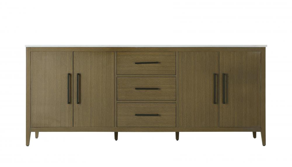 The flat-panel soft-closing drawers feature thin black barpulls, offering a smooth and quiet operation, adding a luxurious touch to everyday use.
