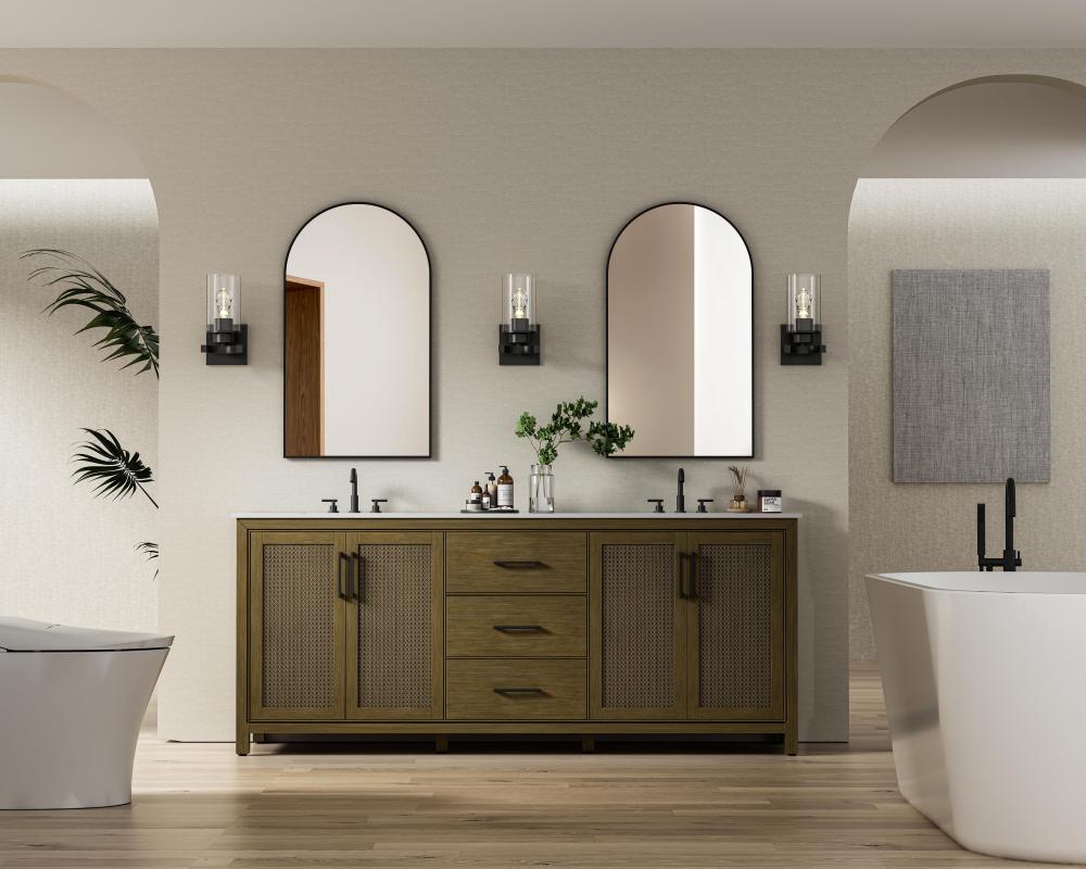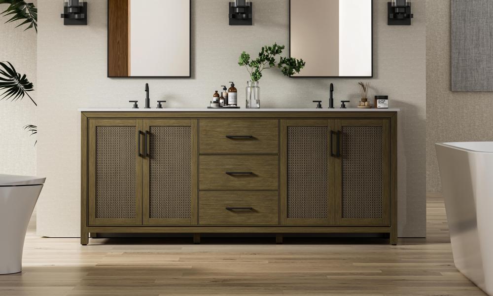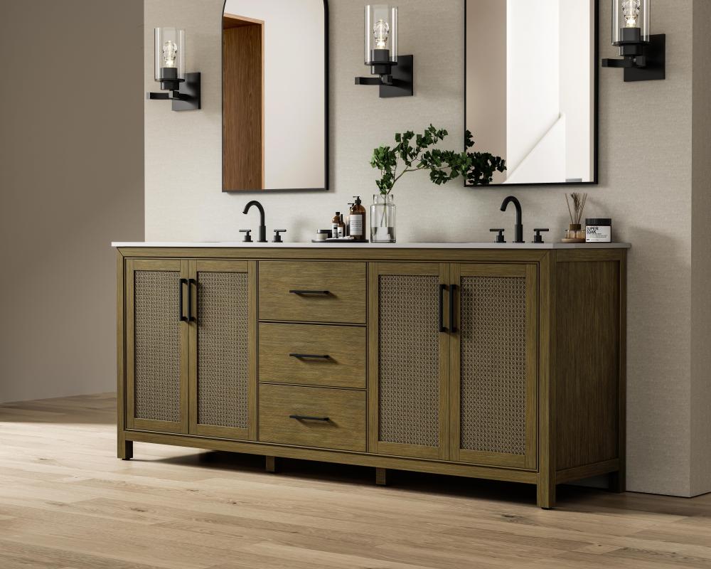 Perfect for those with an eye for detail and quality, this transitional vanity blends modern design with timeless elegance. Available in five stunning finishes, from Crisp White to Linen Oak, the wood grain visuals of the oak options bring warmth and character to any bathroom. The caning design on the Shaker-style door panels adds texture and a touch of refinement, while the soft-closing doors and drawers ensure smooth, quiet functionality. Topped with a white engineered marble countertop, the vanity offers both luxury and practicality, complete with pre-drilled faucet holes for customization. A concealed overflow and U-shaped shelf for plumbing make installation effortless, and the slender black metal pulls provide a sleek contrast.