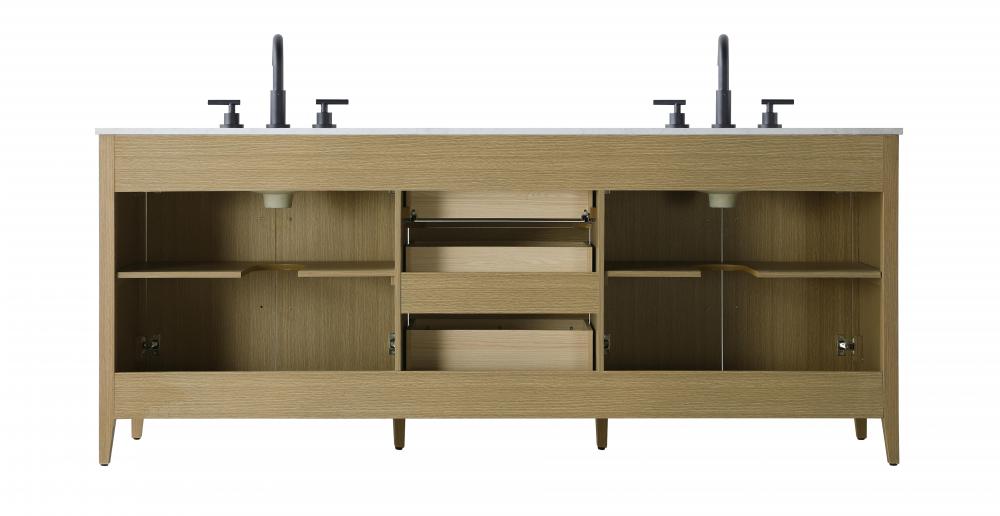 Bring both elegance and practicality to your bathroom with this transitional vanity, available in a selection of rich finishes that highlight the beauty of faux wood grain in shades of mocha, chestnut, and honey, along with classic white and modern grey. The flat door panels and sleek black metal pulls create a minimalist yet refined aesthetic, while the soft-closing drawers and tapered legs with levelers provide smooth, functional operation. Topped with a luxurious white engineered marble countertop and featuring a porcelain sink, this vanity combines timeless style with modern efficiency. Thoughtfully designed with U-shaped cutout for plumbing, it offers ample storage and easy installation, making it the perfect centerpiece for any bathroom.