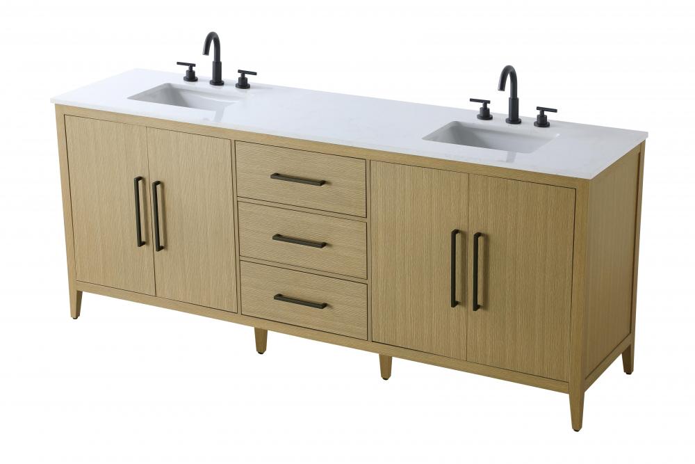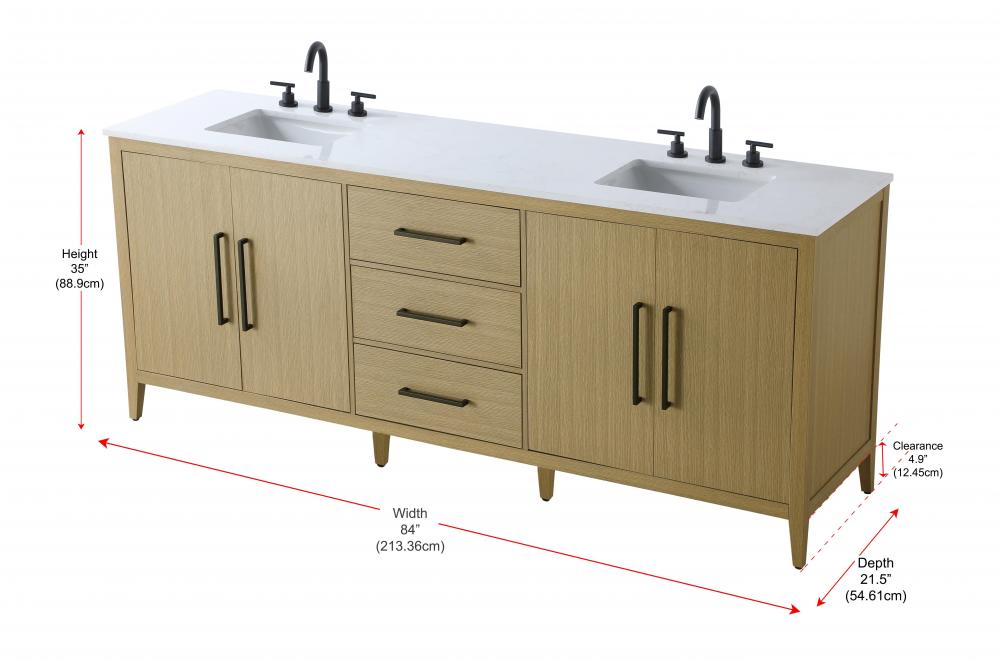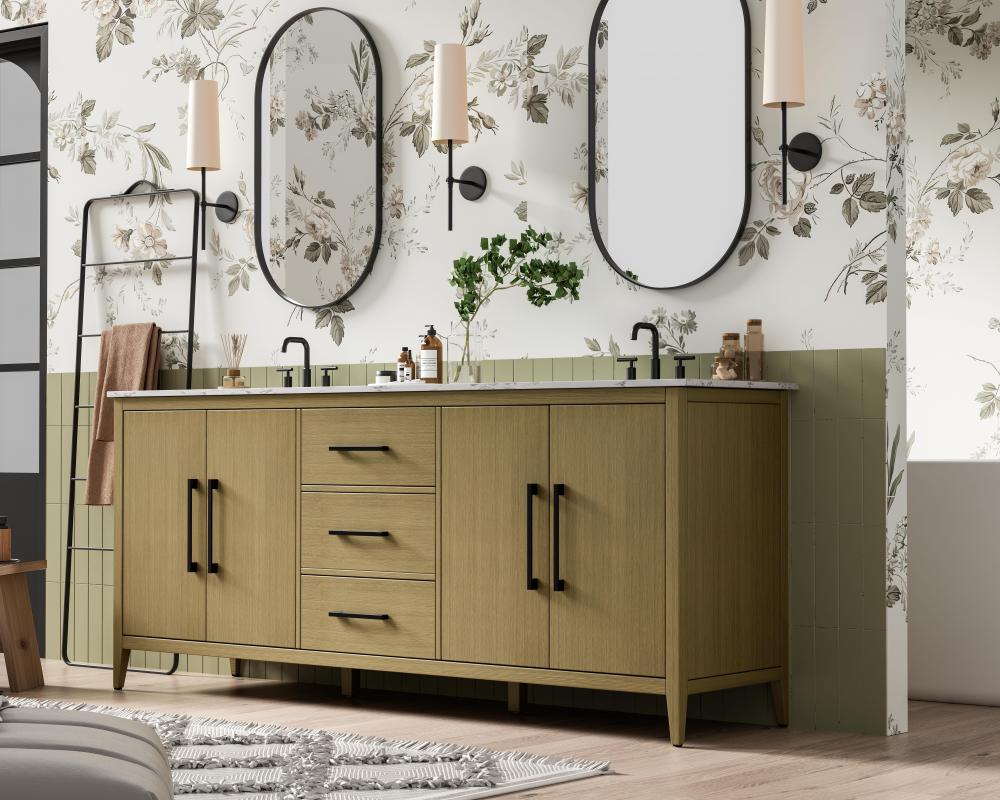 The vanity stands on tapered 5-inch solid wood legs with levelers for a balanced, polished look, combining modern style with practicality.