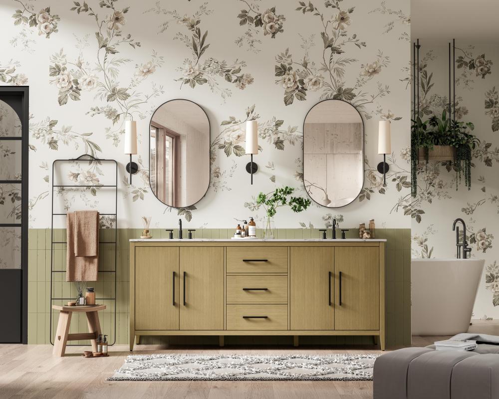 The minimalist flat door panels create a sleek, modern appearance, perfect for blending into transitional and contemporary bathroom designs.