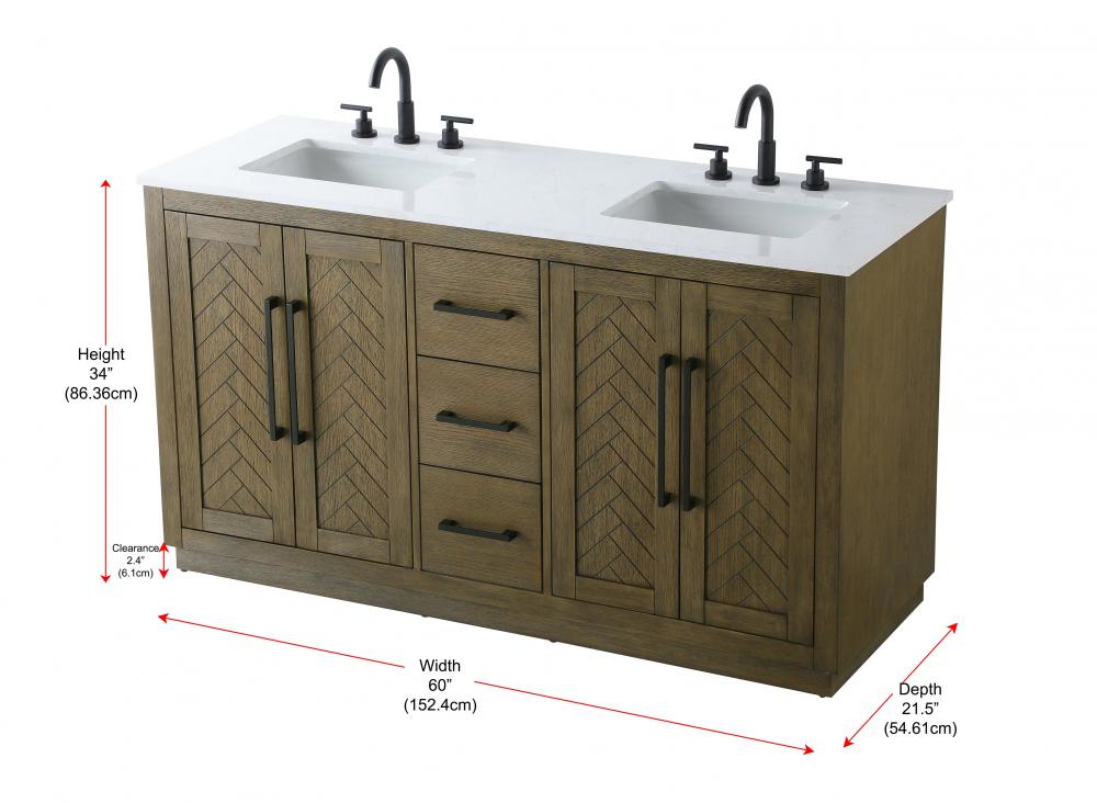 This transitional bathroom vanity offers the perfect blend of timeless style and modern functionality. Available in five refined finishes—crisp white, sleek grey, chocolate oak, honey oak, and linen oak—it complements a range of decor styles, from classic to contemporary. The stunning herringbone design on the Shaker-style door panels adds texture and craftsmanship to the piece. Topped with a white engineered marble countertop featuring subtle veining, it provides both beauty and durability. The long black metal pulls on the soft-closing doors and the thin bar pulls on the drawers add sleek, modern detailing. Practical features include a concealed overflow, a back panel cutout for easy plumbing installation, and a U-shaped cutout shelf to fit plumbing while maximizing storage space. with a toe kick all around the base, this vanity is thoughtfully designed to blend form and function in any bathroom setting.