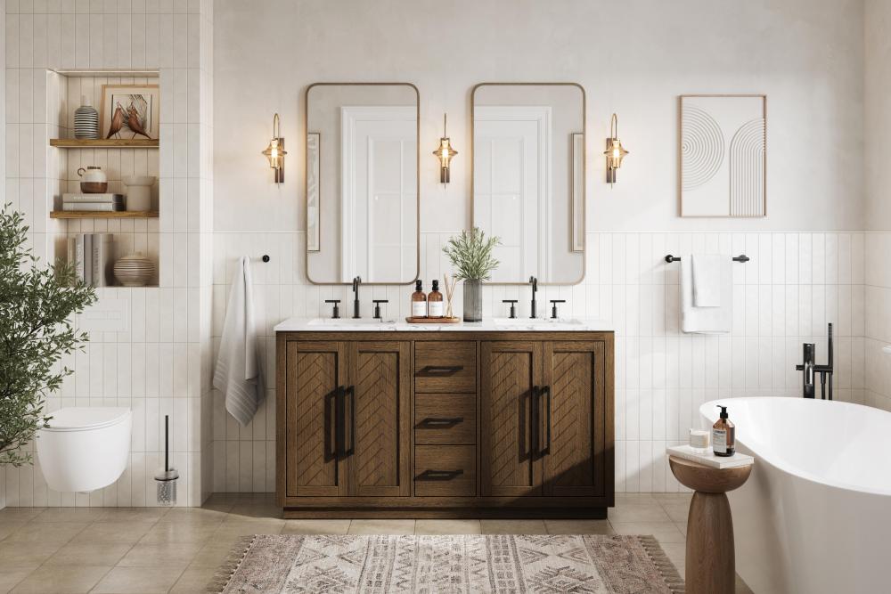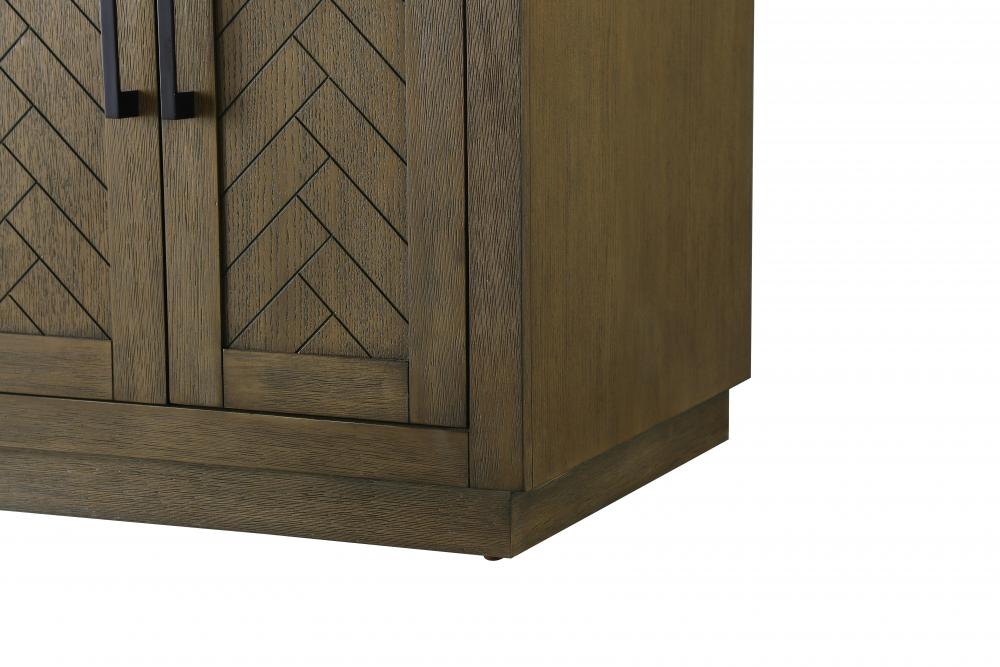 Each finish enhances the unique herringbone design on the Shaker-style door panels, adding a touch of craftsmanship and texture that elevates the overall design of the vanity.