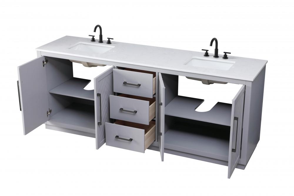 This transitional bathroom vanity offers the perfect blend of timeless style and modern functionality. Available in five refined finishes—crisp white, sleek grey, chocolate oak, honey oak, and linen oak—it complements a range of decor styles, from classic to contemporary. The stunning herringbone design on the Shaker-style door panels adds texture and craftsmanship to the piece. Topped with a white engineered marble countertop featuring subtle veining, it provides both beauty and durability. The long black metal pulls on the soft-closing doors and the thin bar pulls on the drawers add sleek, modern detailing. Practical features include a concealed overflow, a back panel cutout for easy plumbing installation, and a U-shaped cutout shelf to fit plumbing while maximizing storage space. with a toe kick all around the base, this vanity is thoughtfully designed to blend form and function in any bathroom setting.