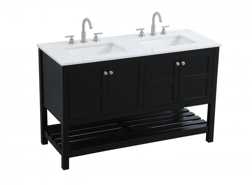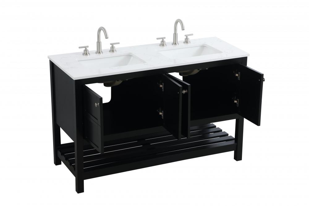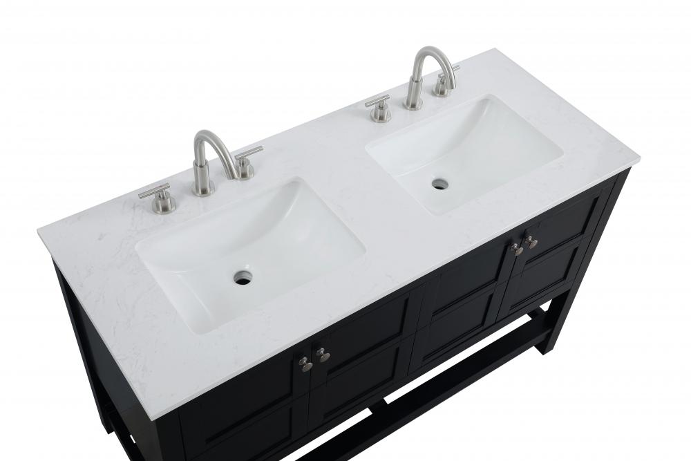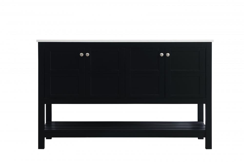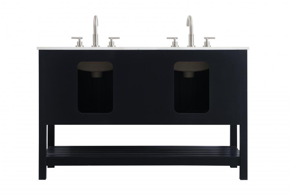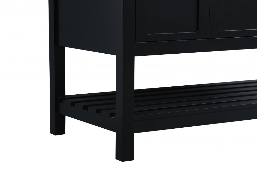 The Theo Collection Vanity effortlessly combines subtle beauty and practical luxury to elevate any bathroom or powder room. Its modern yet timeless design enhances your space without overwhelming it. The calacatta engineered marble countertop paired with a porcelain undermount sink exudes quiet sophistication, while the sturdy legs ensure lasting support. The brushed nickel hardware complements the classic black finish, with elegant pulls accenting the four cabinet doors that open to reveal generous storage space. An additional slated shelf provides perfect organization for towels or other bathroom essentials. Whether placed in your master bath or a guest powder room, this vanity brings refined elegance and functionality, making it the ideal choice for any home.