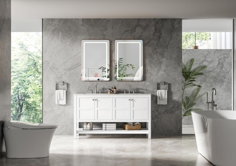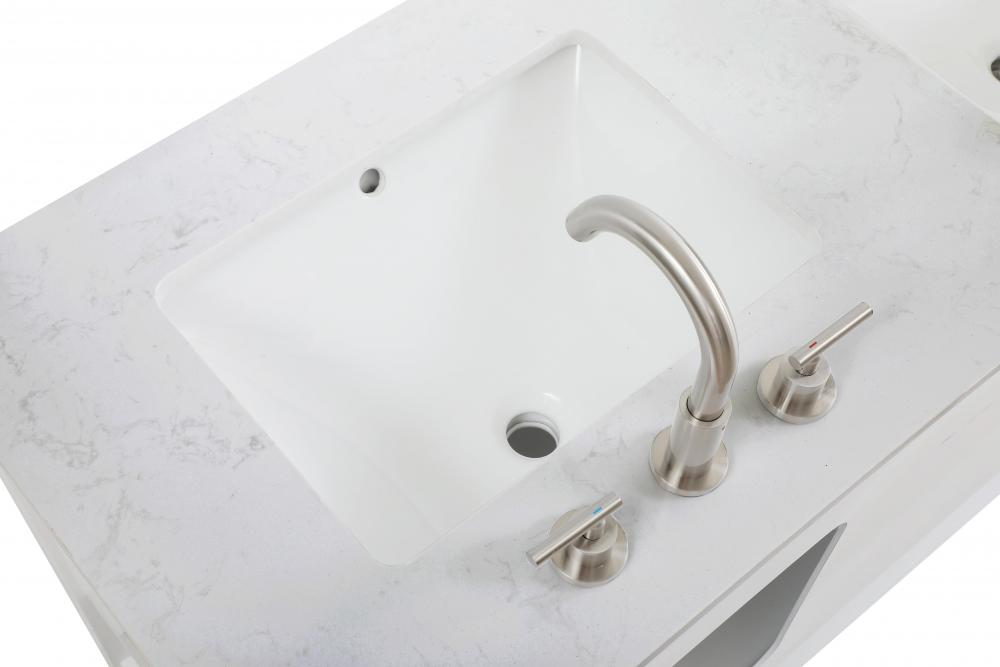 Equipped with an undermount porcelain sink, offering a sleek and seamless appearance for a polished bathroom finish.