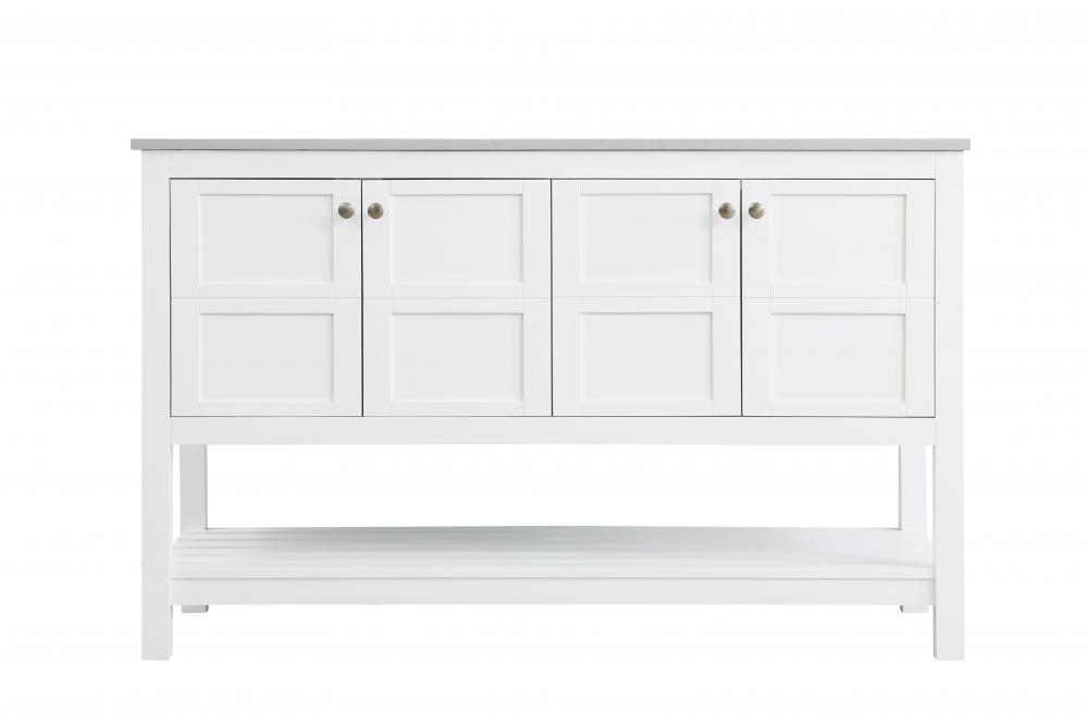 The Theo Collection Vanity effortlessly combines subtle beauty and practical luxury to elevate any bathroom or powder room. Its modern yet timeless design enhances your space without overwhelming it. The calacatta engineered marble countertop paired with a porcelain undermount sink exudes quiet sophistication, while the sturdy legs ensure lasting support. The brushed nickel hardware complements the classic black finish, with elegant pulls accenting the four cabinet doors that open to reveal generous storage space. An additional slated shelf provides perfect organization for towels or other bathroom essentials. Whether placed in your master bath or a guest powder room, this vanity brings refined elegance and functionality, making it the ideal choice for any home.