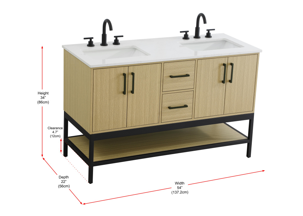 Upgrade your bathroom with this modern bathroom vanity that combines form and function effortlessly. Its sleek wood veneer cabinetry, paired with a bold black metal frame, brings a clean, contemporary vibe to any space. Designed with practicality in mind, this vanity offers soft-close drawers and cabinets to organize your essentials, as well as an open lower shelf for added storage or display. The durable white quartz countertop is built to withstand daily use, while the undermount ceramic sink ensures easy maintenance. Complete with matte black hardware and pre-drilled features for effortless installation, this vanity is the perfect centerpiece to refresh your bathroom with style and efficiency.