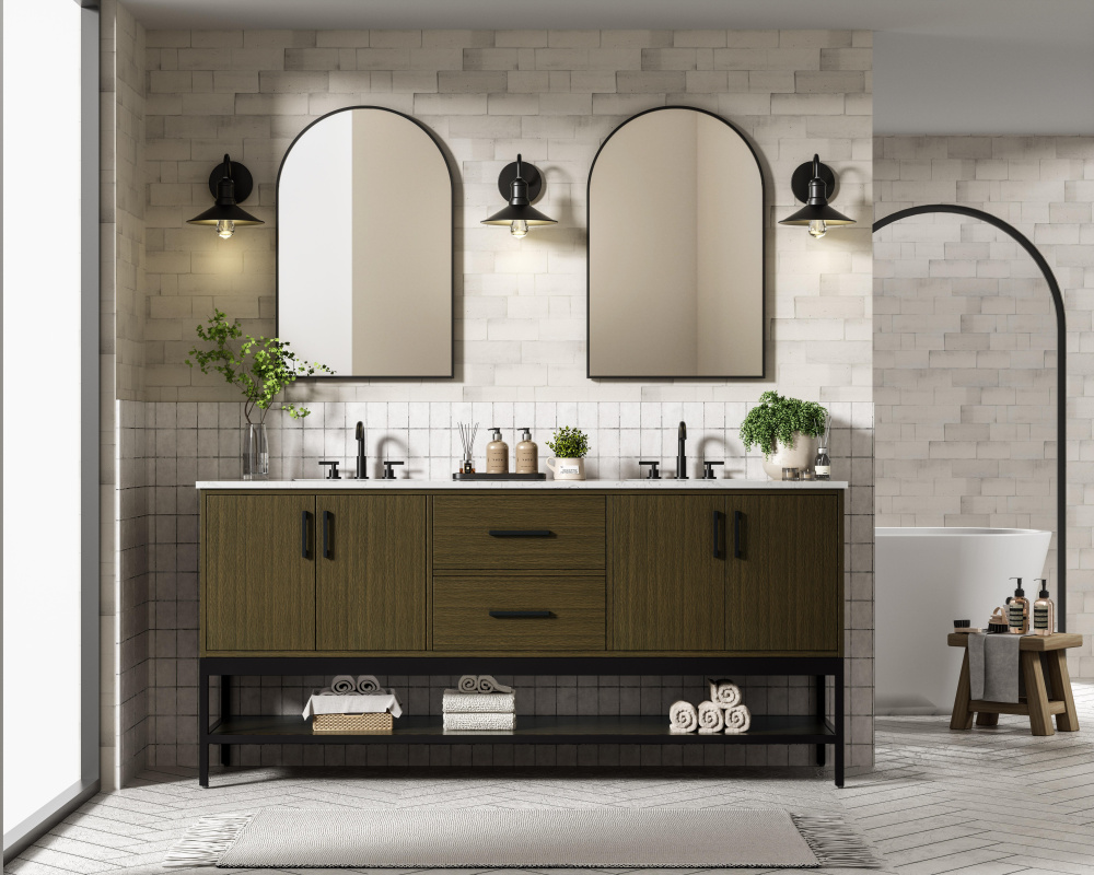Upgrade your bathroom with this modern bathroom vanity that combines form and function effortlessly. Its sleek wood veneer cabinetry, paired with a bold black metal frame, brings a clean, contemporary vibe to any space. Designed with practicality in mind, this vanity offers soft-close drawers and cabinets to organize your essentials, as well as an open lower shelf for added storage or display. The durable white quartz countertop is built to withstand daily use, while the undermount ceramic sink ensures easy maintenance. Complete with matte black hardware and pre-drilled features for effortless installation, this vanity is the perfect centerpiece to refresh your bathroom with style and efficiency.
