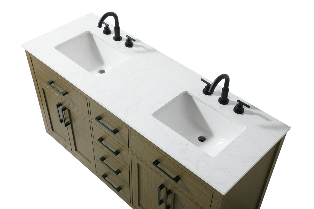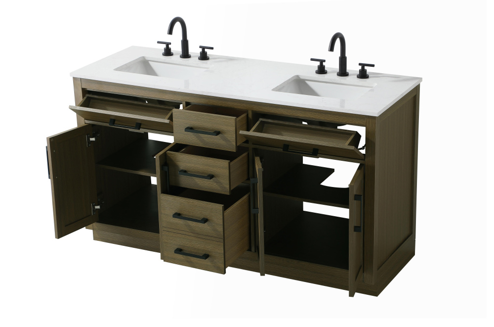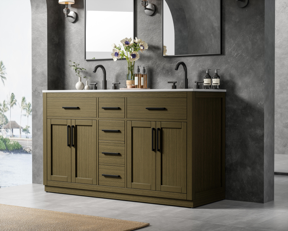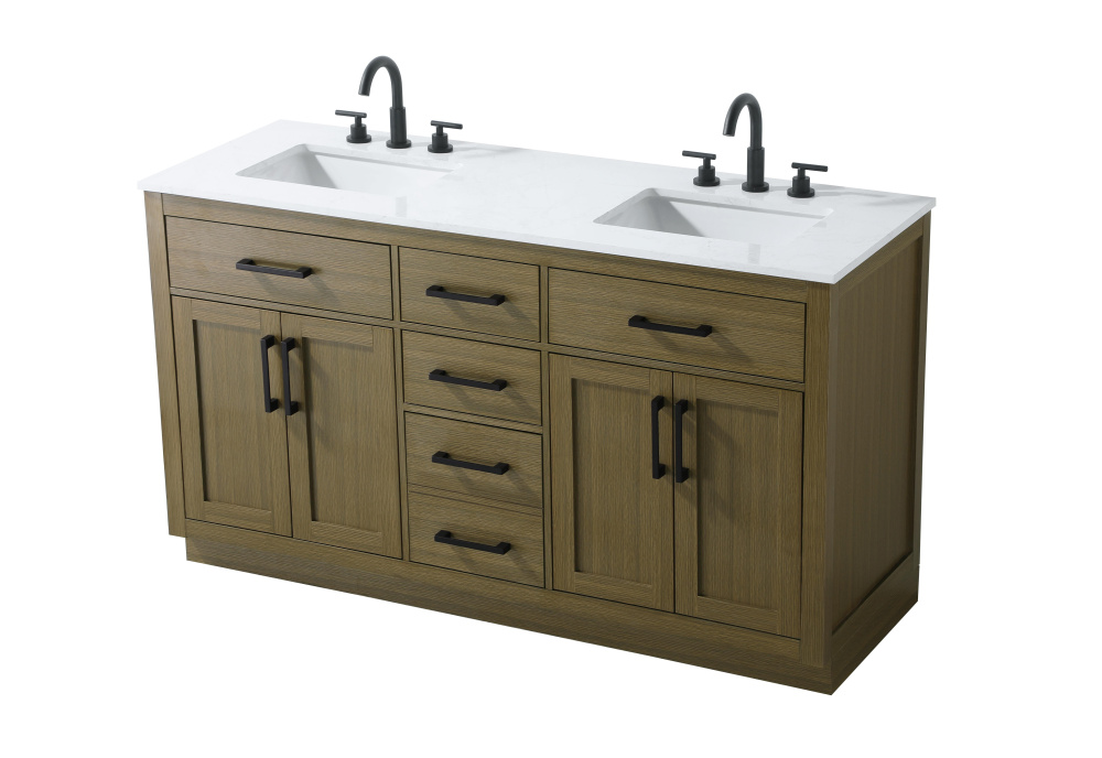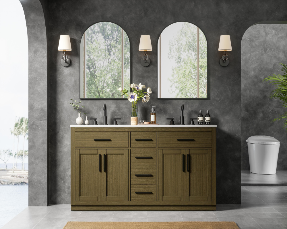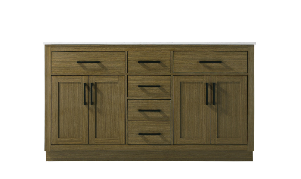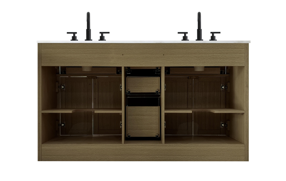 Introduce a perfect balance of functionality and style to your bathroom with this thoughtfully designed vanity. Constructed with a combination of solid wood and MDF, it offers durability and a sturdy build. The sleek engineered marble countertop with subtle grey marbling complements the rustic wood grain finish, creating a stylish and inviting centerpiece for your bathroom. Designed in a contemporary style with a transitional flair, it features a U-shaped shelf for seamless plumbing integration and multiple soft-close drawers for clutter-free organization. A pull-down drawer enhances convenience, while the toe kick adds a refined, clean-lined appearance and simplifies cleaning underneath. Matte black hardware contrasts beautifully with the cabinet finish, tying the look together. Delivered fully assembled and equipped with foot levelers, this vanity combines practicality and aesthetic appeal to suit modern and transitional bathrooms alike.
