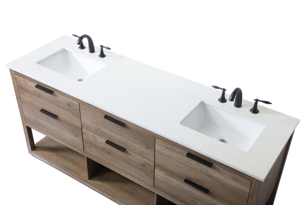 Elevate your bathroom effortlessly with our stylish vanity. Featuring an engineered marble top, and chic straight edge cut, it brings a one-of-a-kind touch of modern elegance. The four functional soft-close drawers, adorned with sleek pulls, offer both convenient storage and a contemporary aesthetic, while two faux top drawers add an extra design flair. Completing the ensemble, two undermount porcelain sinks add timeless charm. The vanity's open shelf at the bottom provides extra storage and a space to showcase decor. As a freestanding unit, this hassle-free solution requires no assembly. Customize your space effortlessly with this sophisticated option for instant bathroom elegance.