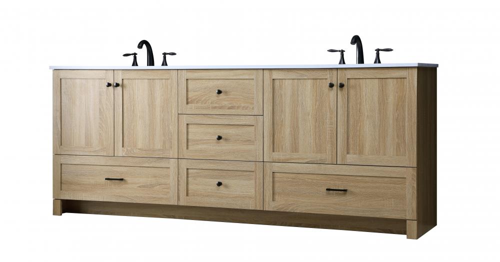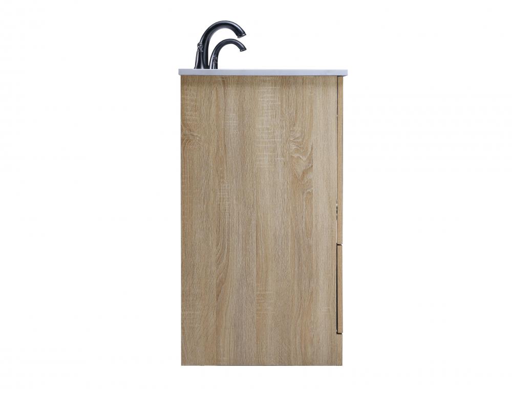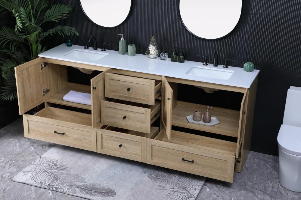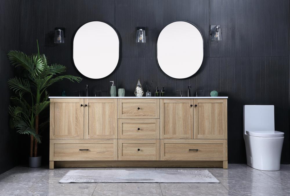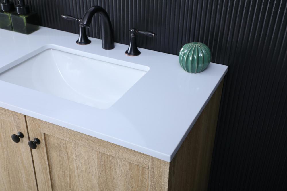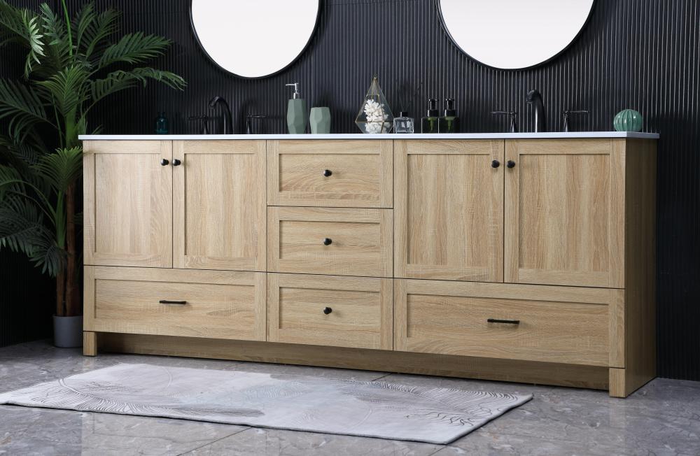 Revel in the beauty of a vanity that mimics the charm of real wood without the maintenance, boasting a faux wood look that adds a touch of natural warmth and rustic sophistication to your bathroom.