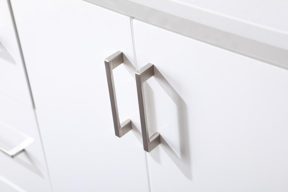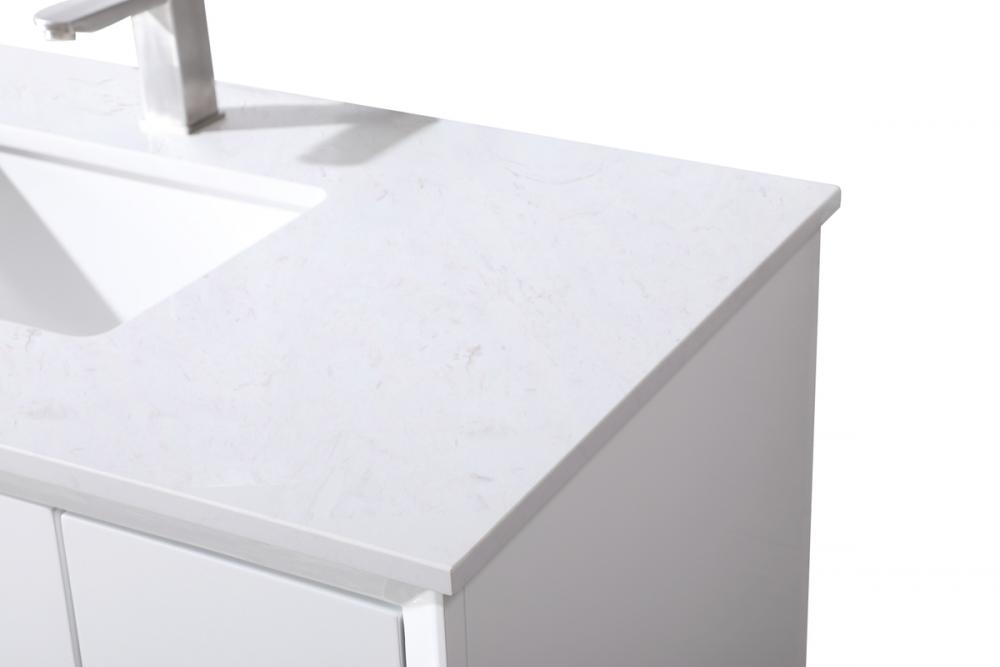 Experience luxury with a 0.75-inch thick engineered marble countertop featuring a calacatta design with light grey veining, seamlessly blending durability with timeless elegance.