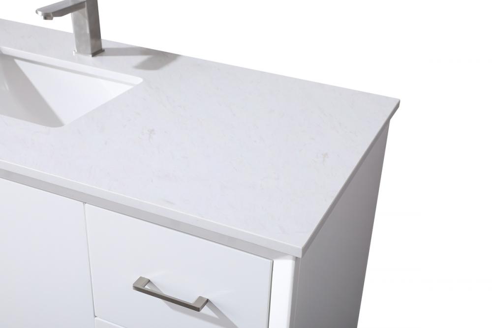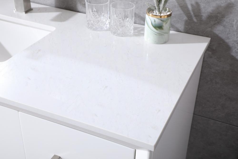 Experience luxury with a 0.75-inch thick engineered marble countertop featuring a calacatta design with light grey veining, seamlessly blending durability with timeless elegance.
