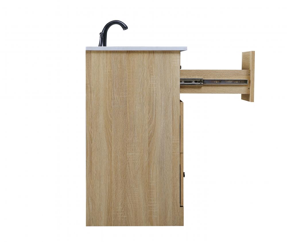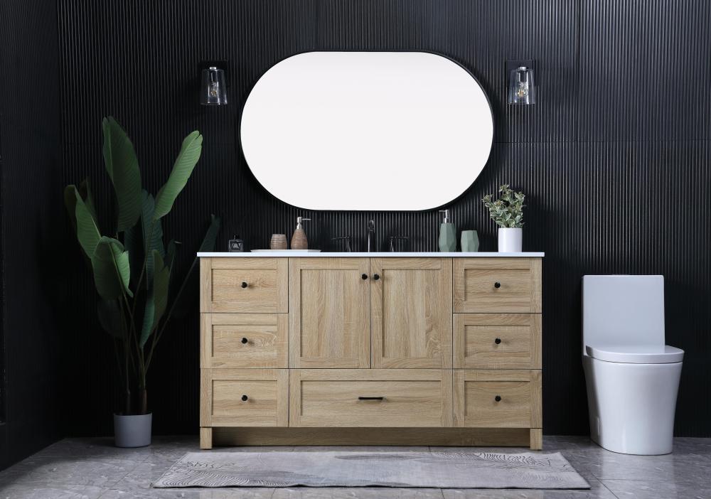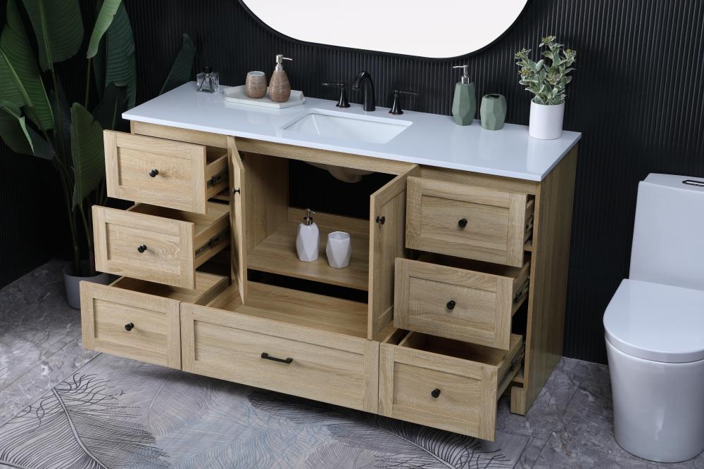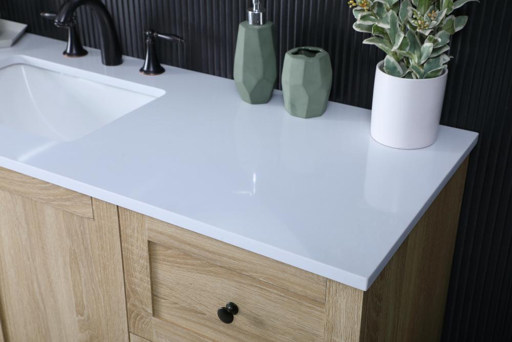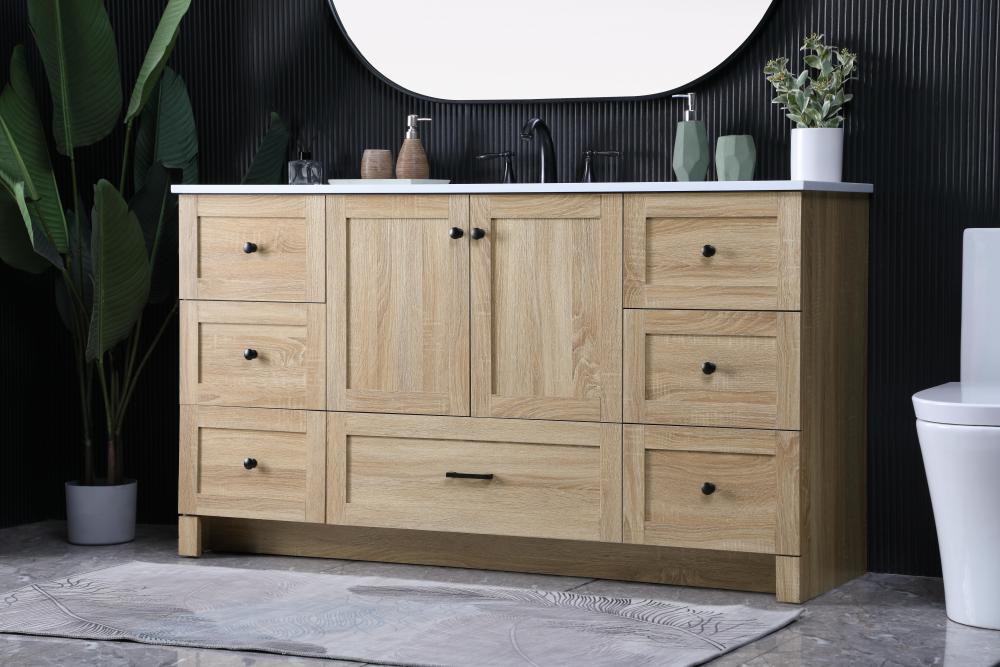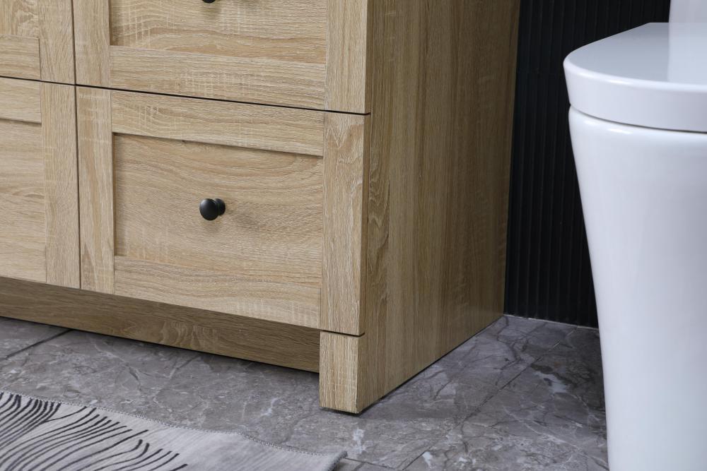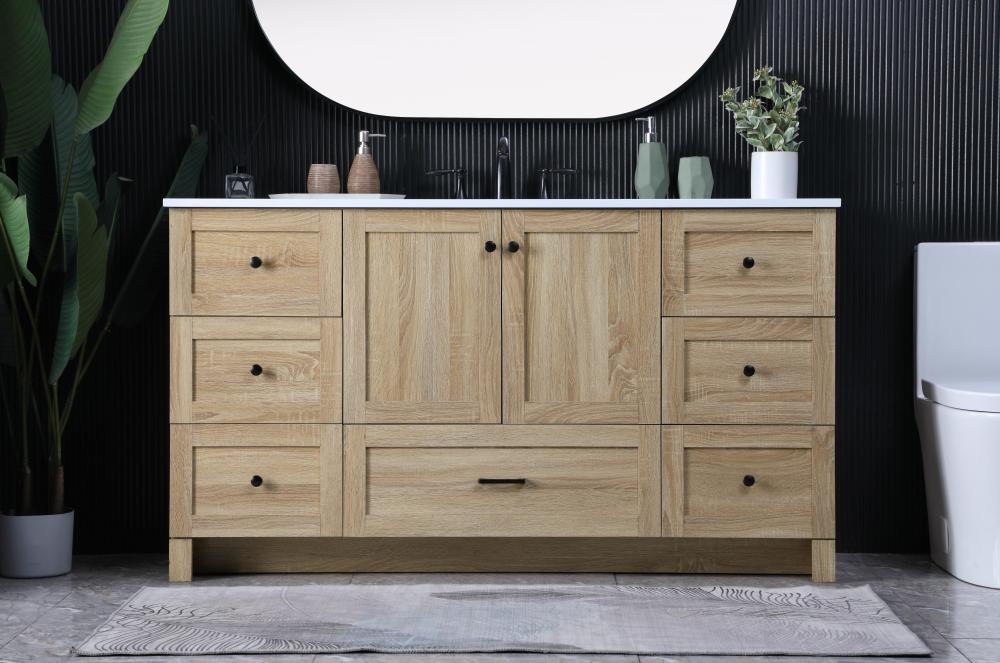 Revel in the beauty of a vanity that mimics the charm of real wood without the maintenance, boasting a faux wood look that adds a touch of natural warmth and rustic sophistication to your bathroom.