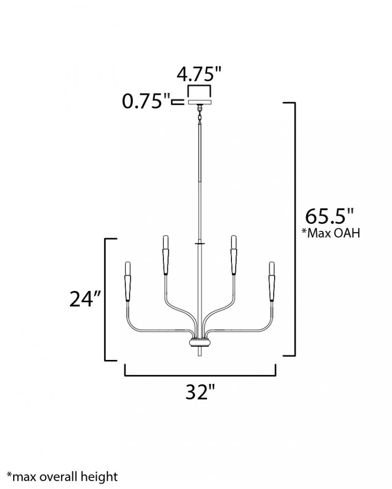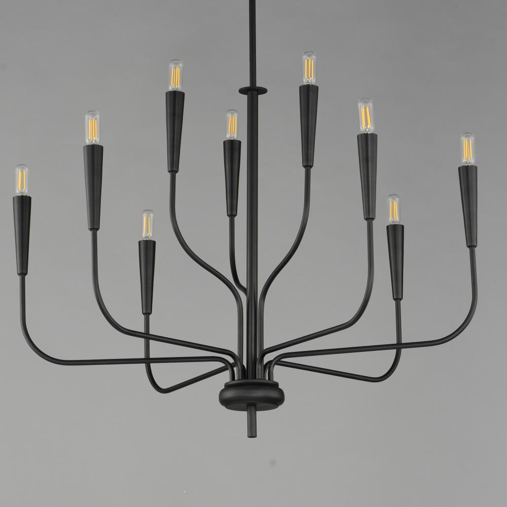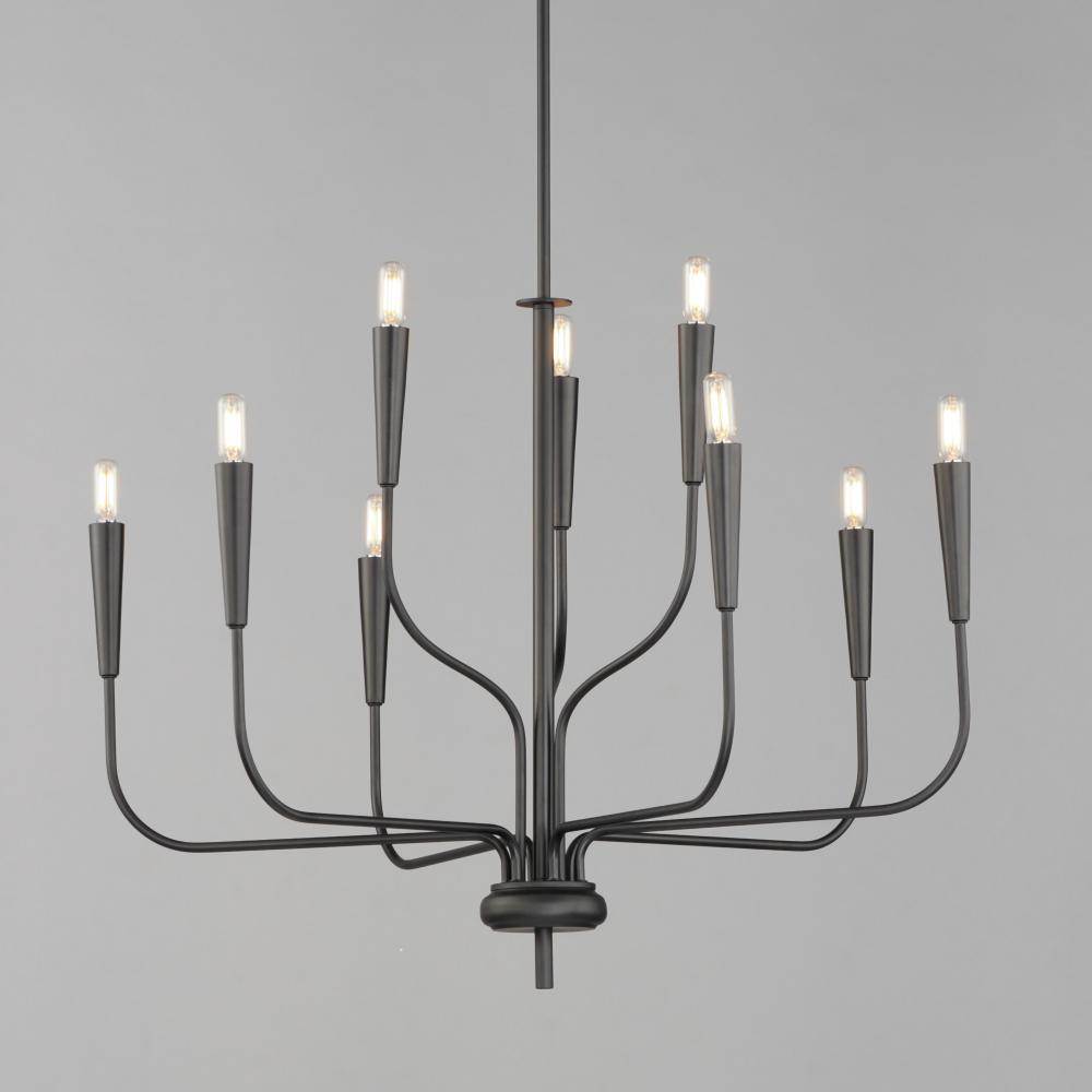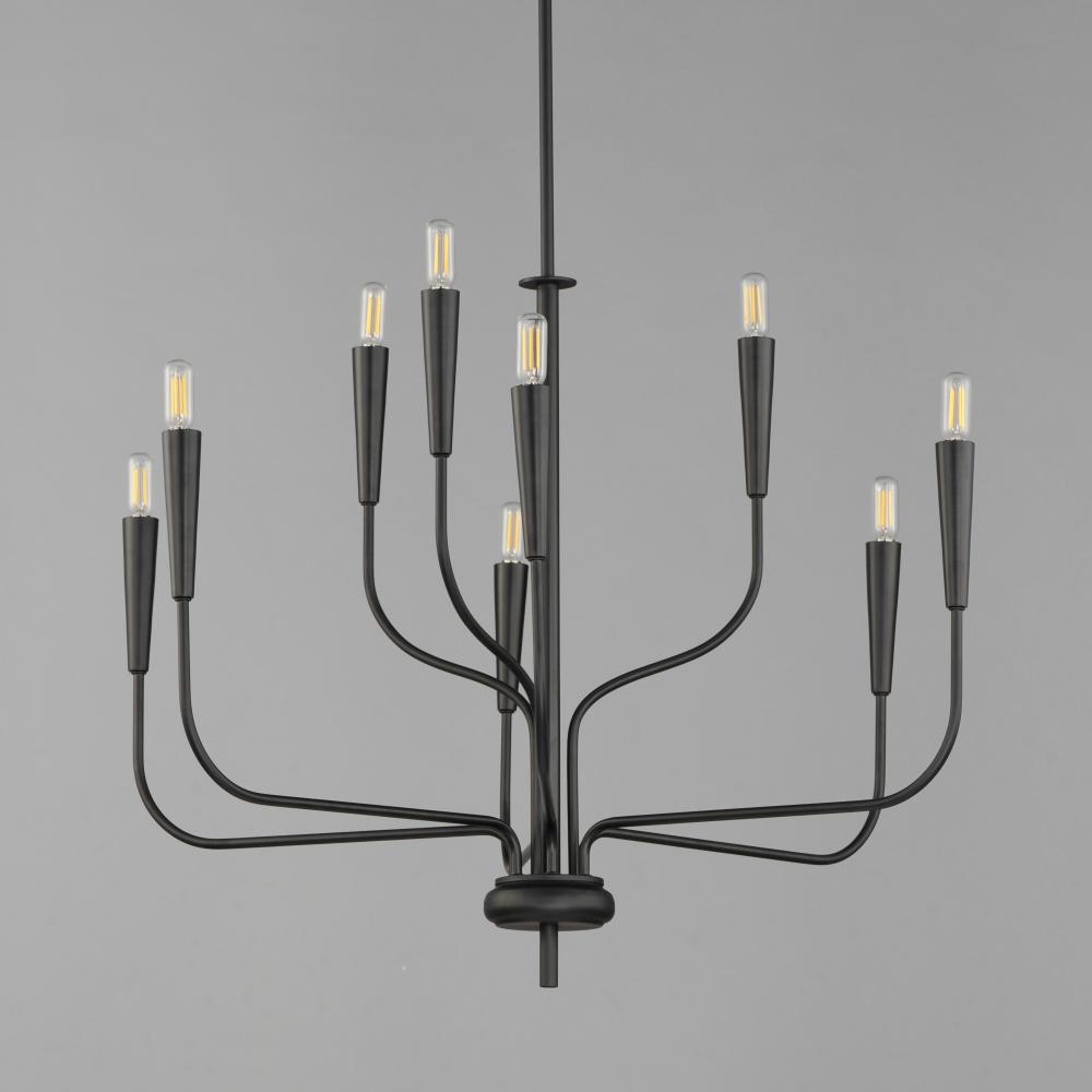 A simple candle style chandelier is given a modern edge with tall tapered candle covers that sit at the ends of curved arms without a bobeche beneath them. Available in Satin Brass or Matte Black, the collection compliments many architectural interiors and