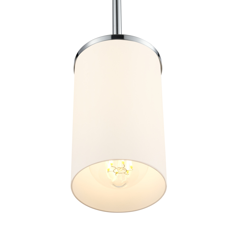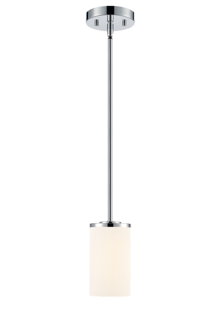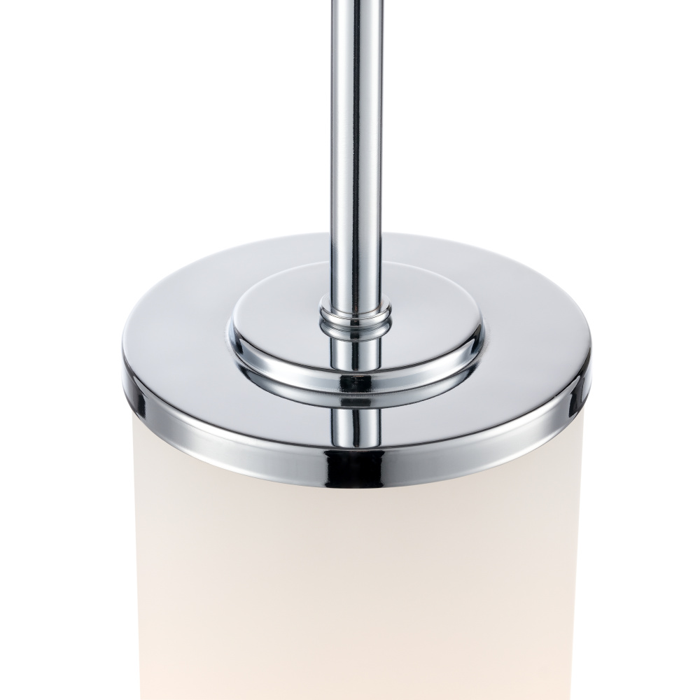 This fixture features a chrome finish and etched white glass shade.