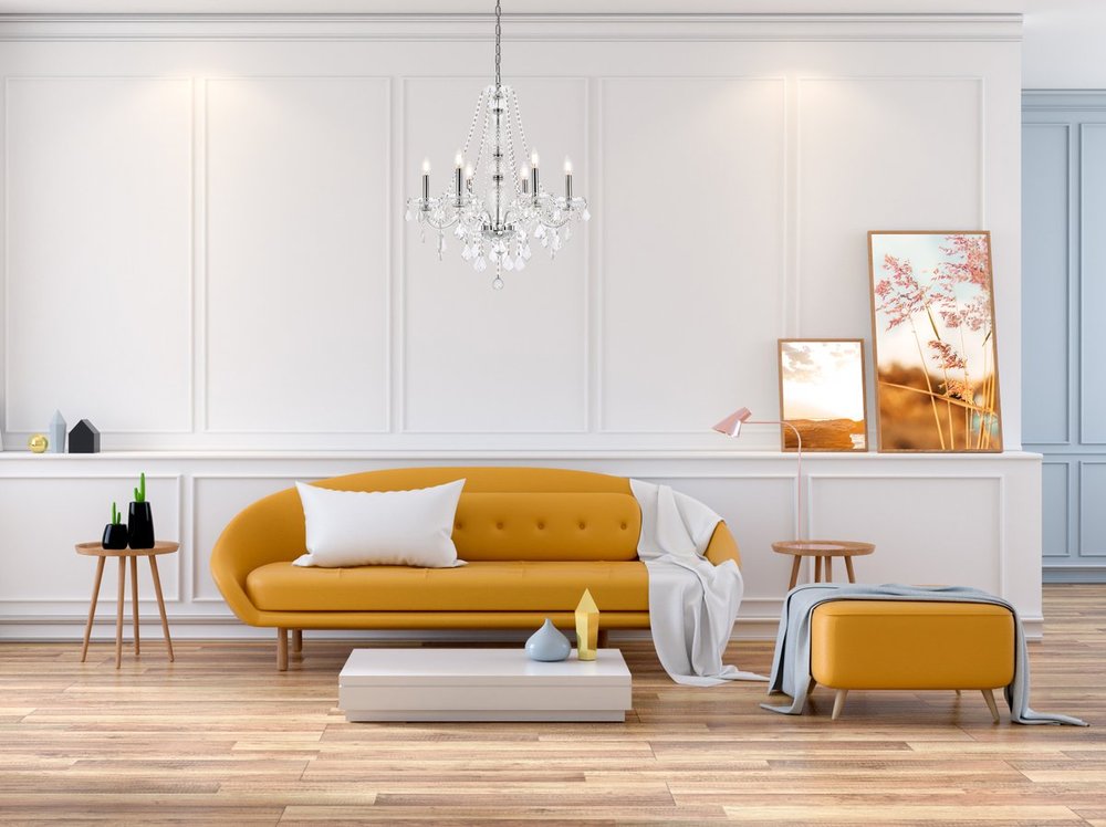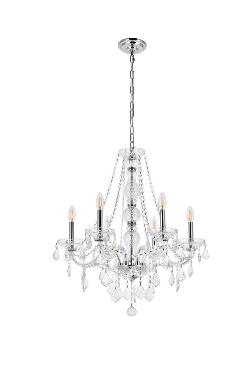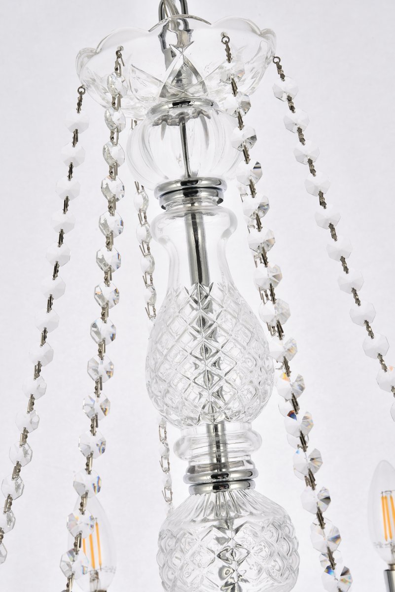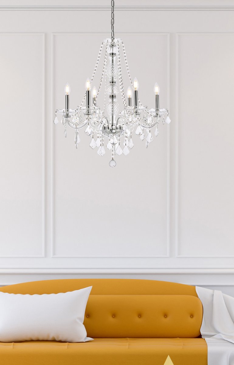 A luxurious chandelier from the Verona collection can instantly define your sophisticated style and classic taste. Six graceful arms supporting candelabra lights (not included) on crystal bobéches converge at the base of a magnificent cut-crystal center column, which is draped with strands of crystal beads. Other adornments include gorgeous crystal droplets, rings, and pendeloques. Available with a choice of finishes and types of crystal.
