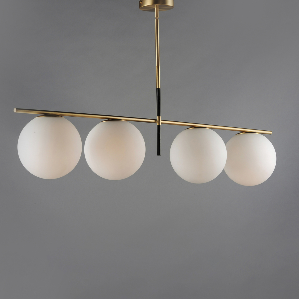 Inspired by both Mid Century Modern and Scandinavian Contemporary this collection spans a large breadth of today's interior design. Straight tubing finished in Satin Brass supports hand blown Satin White cased glass globes. Black accents of metal and B