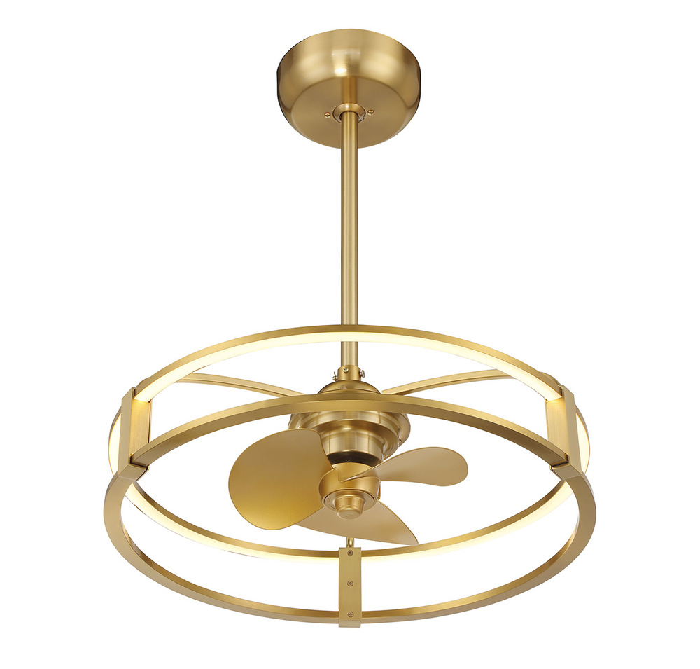 Cool and cutting-edge, the Savoy House Vesta Fan D'Lier reinvents the chandelier and the ceiling fan in one fabulously fashionable fixture. Bands of integrated LED light surround the fan, which is finished in Warm Brass. Vesta uses an efficient DC motor and has a handheld remote control for extra convenience. It is 23" in width and 8.25" in height. Comes with a 4" downrod and an 18" downrod. Fan D'Liers are a Savoy House exclusive. These custom designs are inspired by high-end designer styles and take top trends to a whole new level.