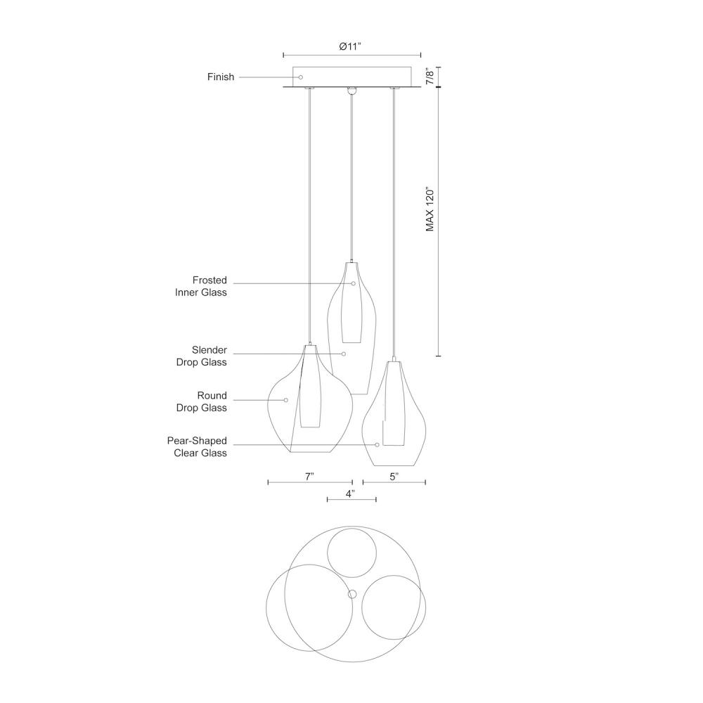 Simplistic elegant round multi LED pendant with three styles of clear outer glass and frosted inner glass each set together as one piece (slender drop, pear shaped and round drop glass shades). New patent pending socket design and Kuzco SSL wire allow this fixture to be 12V AC LED. Metal details in chrome finish. Available in three different glass styled single pendants and a variety of multi-pendant options, see series for full details.