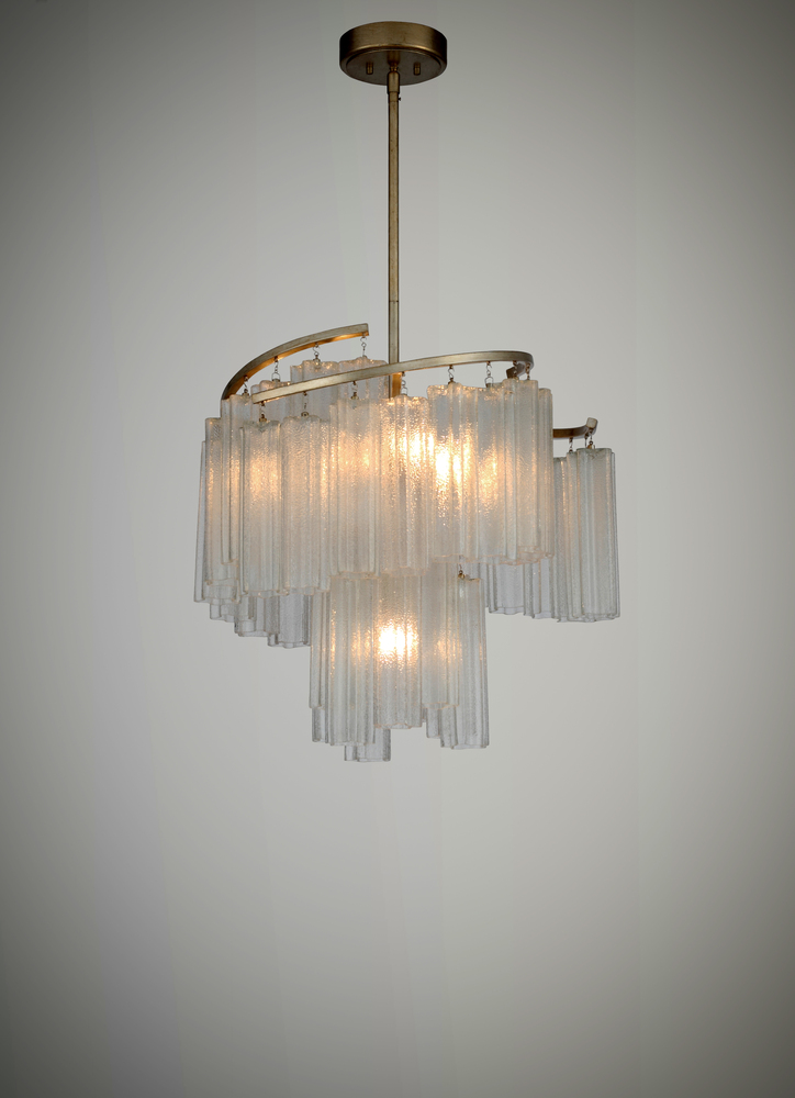 Cascading Waterfall glass shades are suspended from a frame finished in our popular Golden Silver. This elegant collection spans design genres from contemporary to traditional which gives it universal appeal.