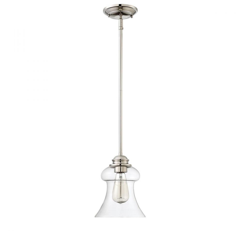 This mini pendant has wonderful, vintage-inspired style! The frame has a polished nickel finish and holds a curved, bell-shaped shade made of pristine clear glass. One 60W standard size bulb allows ample illumination through the glass. Using an Edison or exposed filament bulb will add to the vintage charm. The pendant is 7.5" wide, 10.5" high and has a 20" to 39" adjustable hanging height, making it a perfect size to hang alone, in pairs or in groupings for maximum impact. It’s sure to bring classic, vintage appeal to your dining room, kitchen, living room, bedroom, hallway, family room, office or stairway.