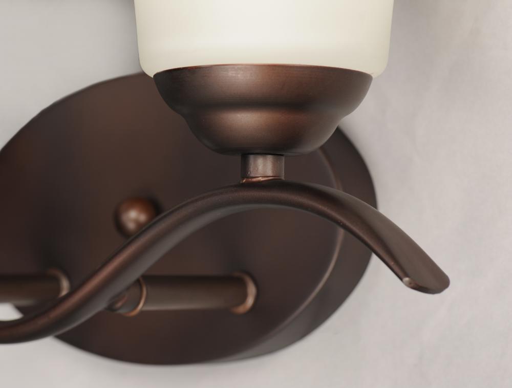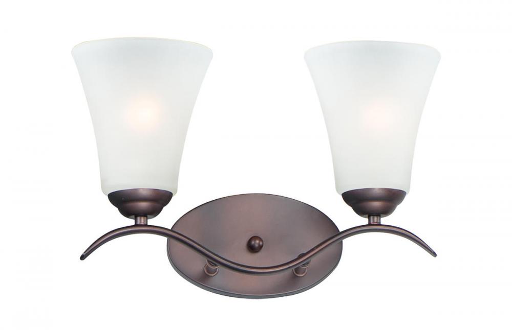 Gently waving arms of Satin Nickel or Oil Rubbed Bronze support tall-profile Frosted glass shades creating a scale normally not found in this category of lighting. The bath vanity may be installed up or down and also includes a Polished Chrome finish.