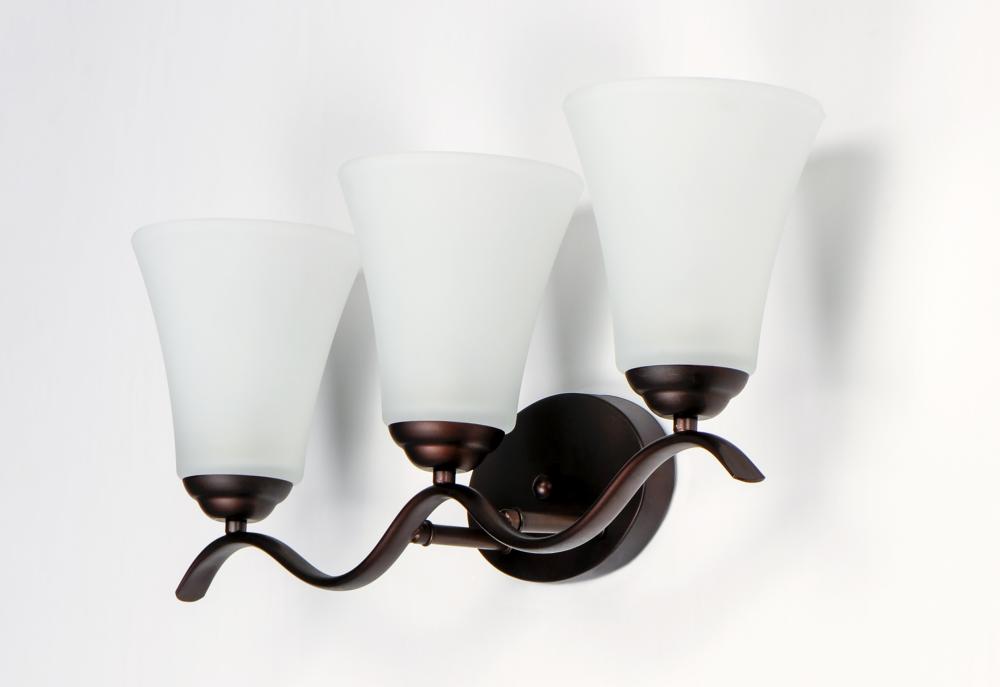 Gently waving arms of Satin Nickel or Oil Rubbed Bronze support tall-profile Frosted glass shades creating a scale normally not found in this category of lighting. The bath vanity may be installed up or down and also includes a Polished Chrome finish.