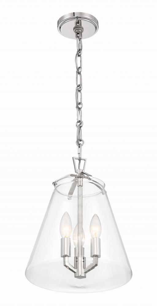 The Voss Collection is a sleek, enduring design with subtle angular details, offered in various finishes and sizes for your unique space. It’s clear glass cone-shaped pendant is closed on the bottom and fastened with metal on its open top. The patterned chain detail adds a touch of character to its streamlined design. The Voss Collection is not confined to a single style; it is a versatile design that suits a variety of spaces, from minimalist and modern to classic and eclectic.