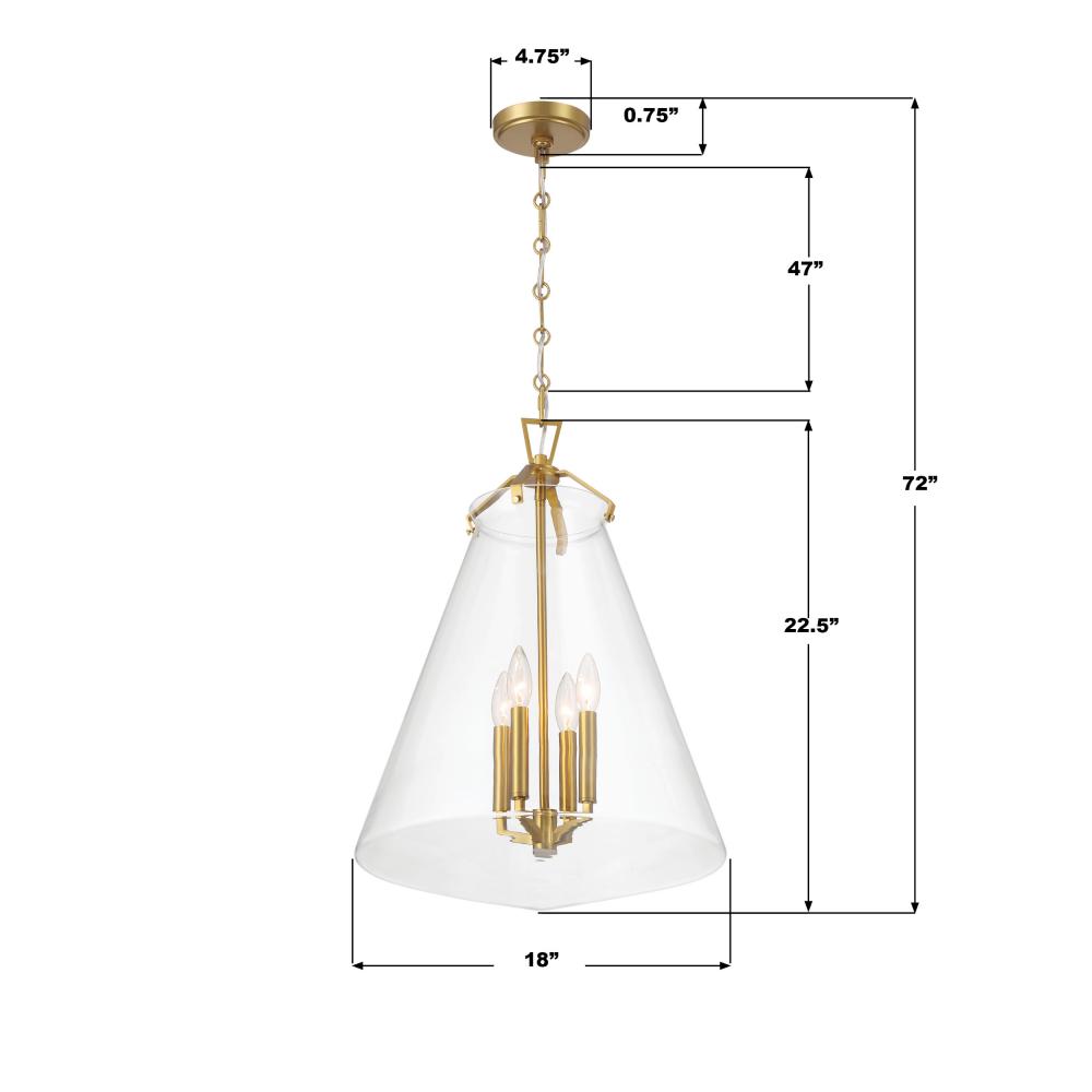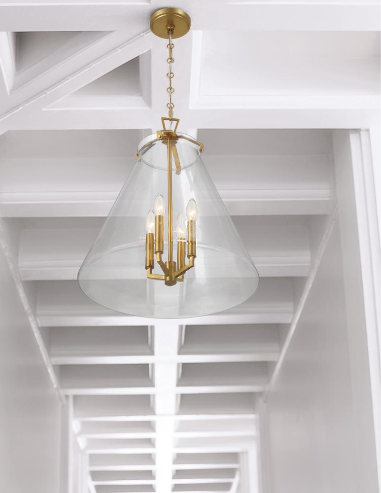 The Voss Collection is a sleek, enduring design with subtle angular details, offered in various finishes and sizes for your unique space. It’s clear glass cone-shaped pendant is closed on the bottom and fastened with metal on its open top. The patterned chain detail adds a touch of character to its streamlined design. The Voss Collection is not confined to a single style; it is a versatile design that suits a variety of spaces, from minimalist and modern to classic and eclectic.