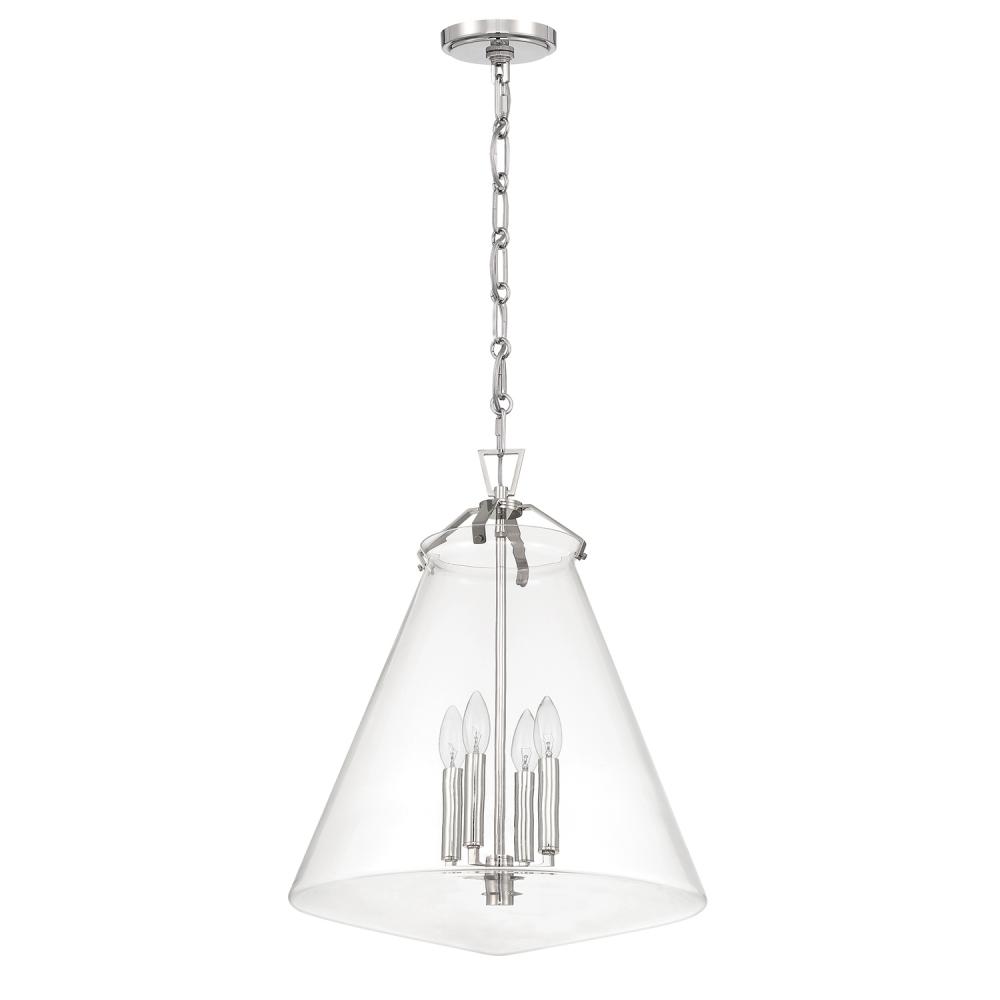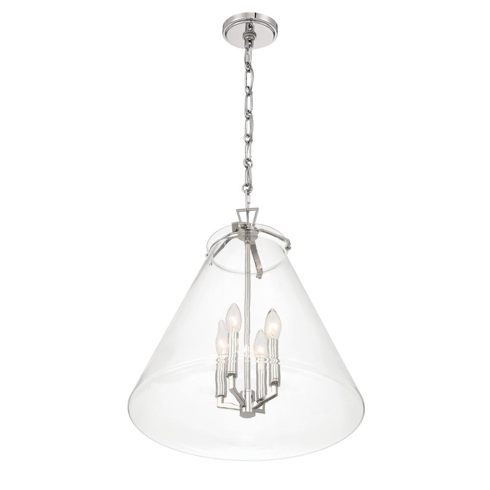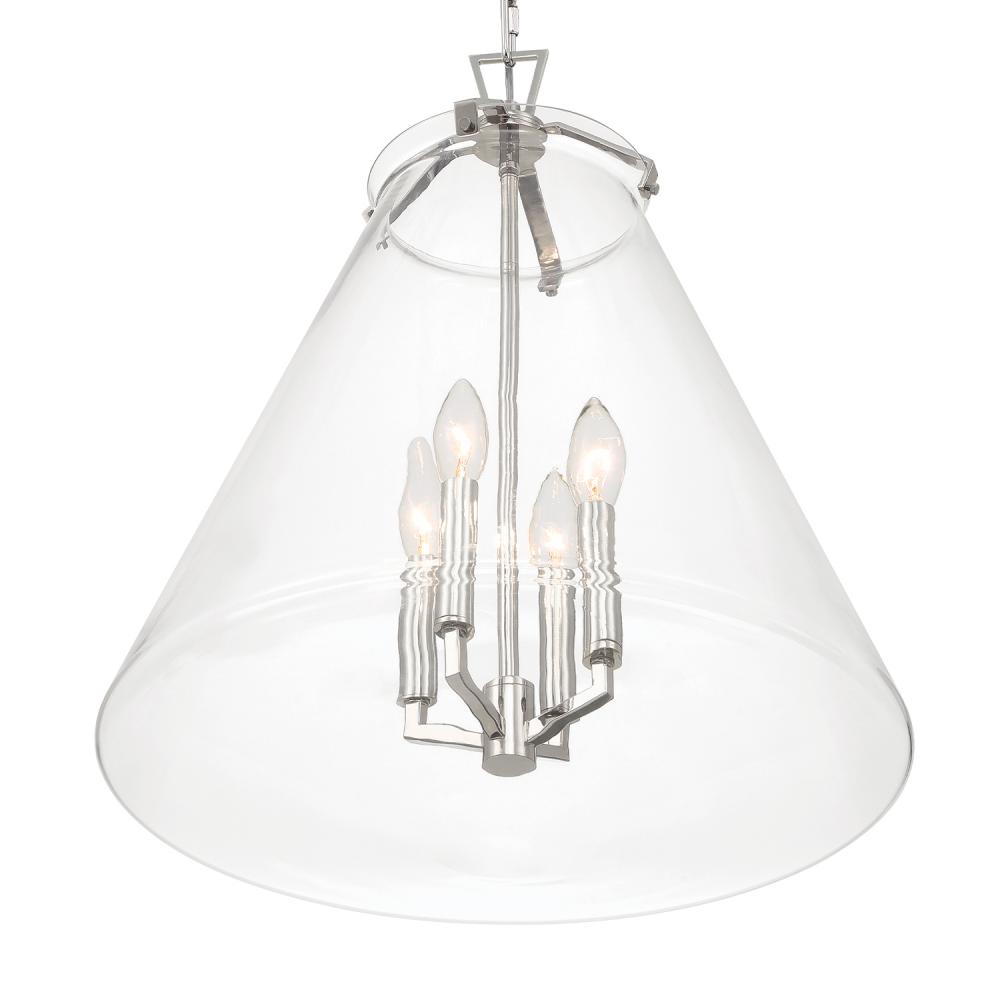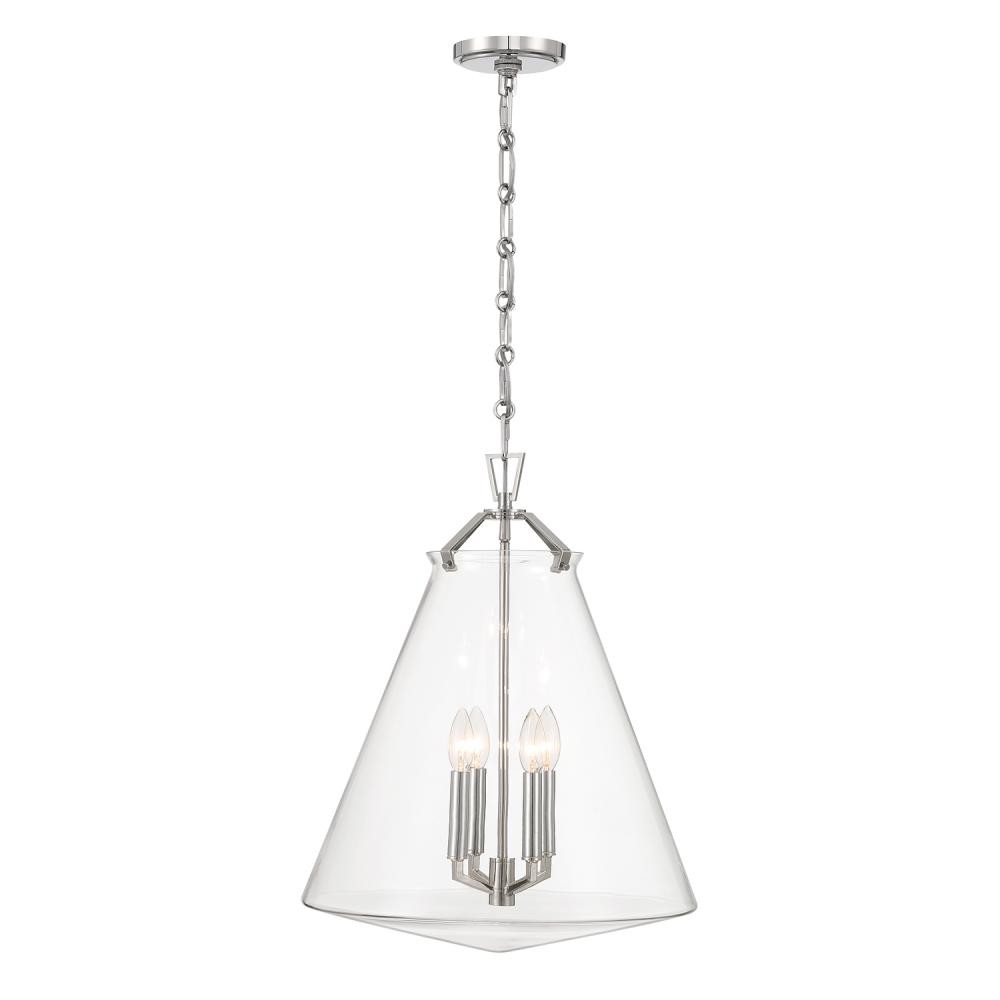 The Voss Collection is a sleek, enduring design with subtle angular details, offered in various finishes and sizes for your unique space. It’s clear glass cone-shaped pendant is closed on the bottom and fastened with metal on its open top. The patterned chain detail adds a touch of character to its streamlined design. The Voss Collection is not confined to a single style; it is a versatile design that suits a variety of spaces, from minimalist and modern to classic and eclectic.