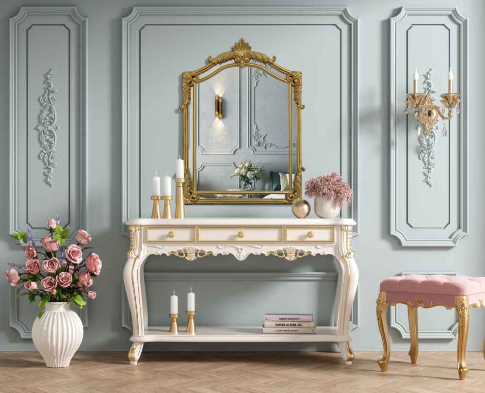 With its ornate crest and intricate corner embellishments, this mirror transforms any space into a masterpiece of classic décor