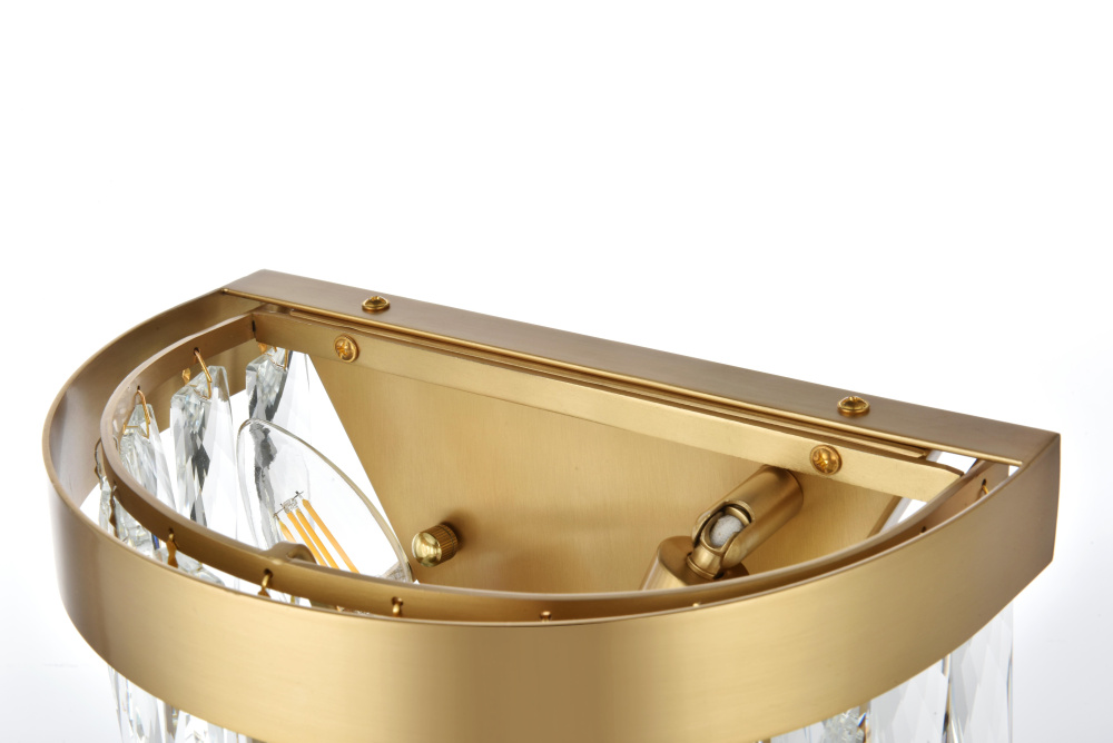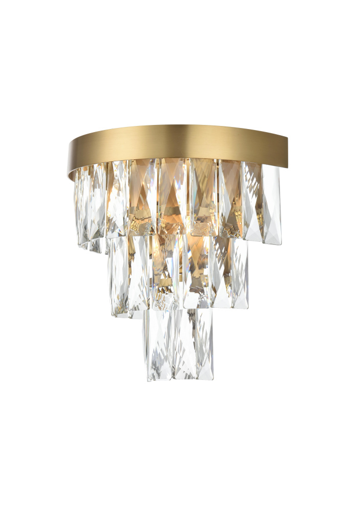 Transform your space with this extraordinary wall sconce that reimagines classical crystal design for contemporary interiors. The masterfully engineered silhouette features three graduating tiers that create a spectacular inverted pyramid, reminiscent of a frozen cascade captured in mid-descent. Each precisely cut rectangular crystal is strategically positioned to maximize light play, creating mesmerizing displays of fractured light throughout your space. The thoughtful construction incorporates 2 light sources distributed throughout the tiers, ensuring both spectacular illumination and enchanting crystal animation. The robust iron framework provides a secure foundation while maintaining visual lightness, allowing the crystals to appear as if floating in space. Available in reflective chrome, sophisticated black, or warm satin gold, this pendant makes an unforgettable statement while maintaining refined restraint. The cascading arrangement creates a sense of movement and flow, while the geometric precision of each crystal adds contemporary edge to the classical form. This is more than a light fixture – it's an architectural feature that transforms your space through its commanding presence and spectacular light performanc