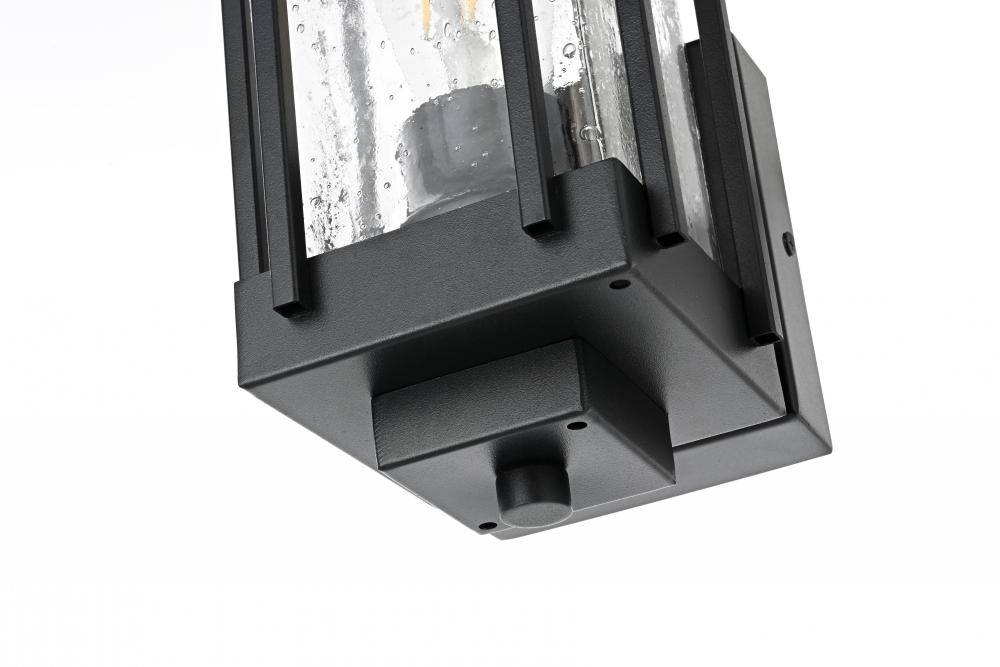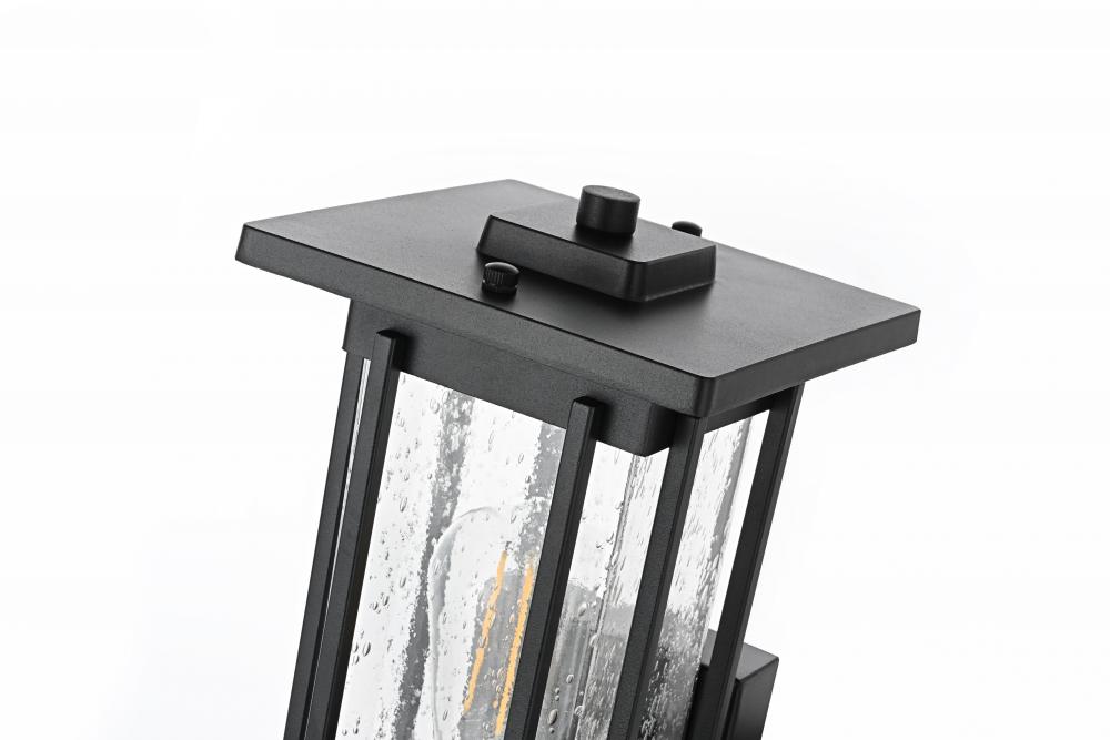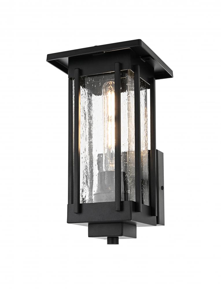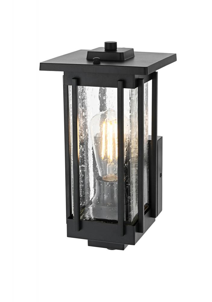 Add a refined touch to your outdoor space with this striking outdoor wall sconce. Crafted with durable iron and clear seeded glass, this sconce exudes a sense of timeless beauty while providing reliable, long-lasting performance. The textured seeded glass creates an eye-catching effect when the light is illuminated, giving off a warm, inviting glow that enhances the ambiance of any exterior setting. The sturdy iron frame in matte black ensures it withstands harsh weather conditions, making it a practical yet stylish addition to your porch, patio, or entryway. Designed to accommodate an E26 base bulb, this wall sconce effortlessly merges classic styling with functional details to ensure that your home’s outdoor lighting is both captivating and dependable.