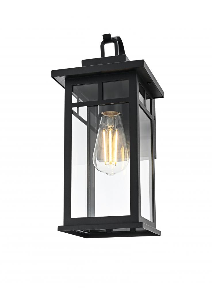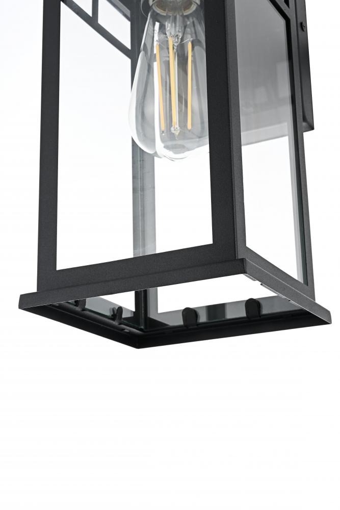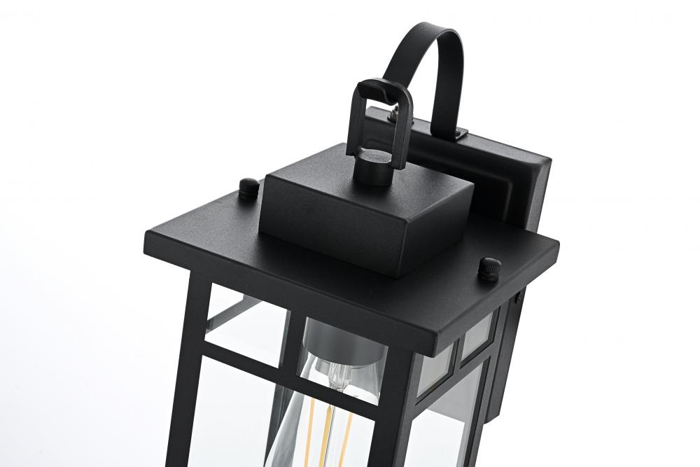 Enhance the curb appeal of your home with this sophisticated outdoor wall sconce. Featuring a sturdy iron frame in a rich matte black finish, this fixture offers a perfect combination of modern aesthetics and traditional charm. Clear glass panels allow for a bright, ambient glow, beautifully showcasing any decorative bulb you choose. with its built-in dusk-to-dawn sensor, you can enjoy automatic lighting that adds both convenience and energy efficiency to your outdoor space. The timeless lantern design complements a wide range of architectural styles while ensuring lasting durability against the elements. Whether it's your front porch, back patio, or any outdoor area, this wall sconce effortlessly blends style with functionality.