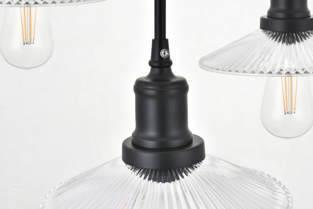 Black finish 3-light pendant light and short cone shaped shade hanging from a circular canopy