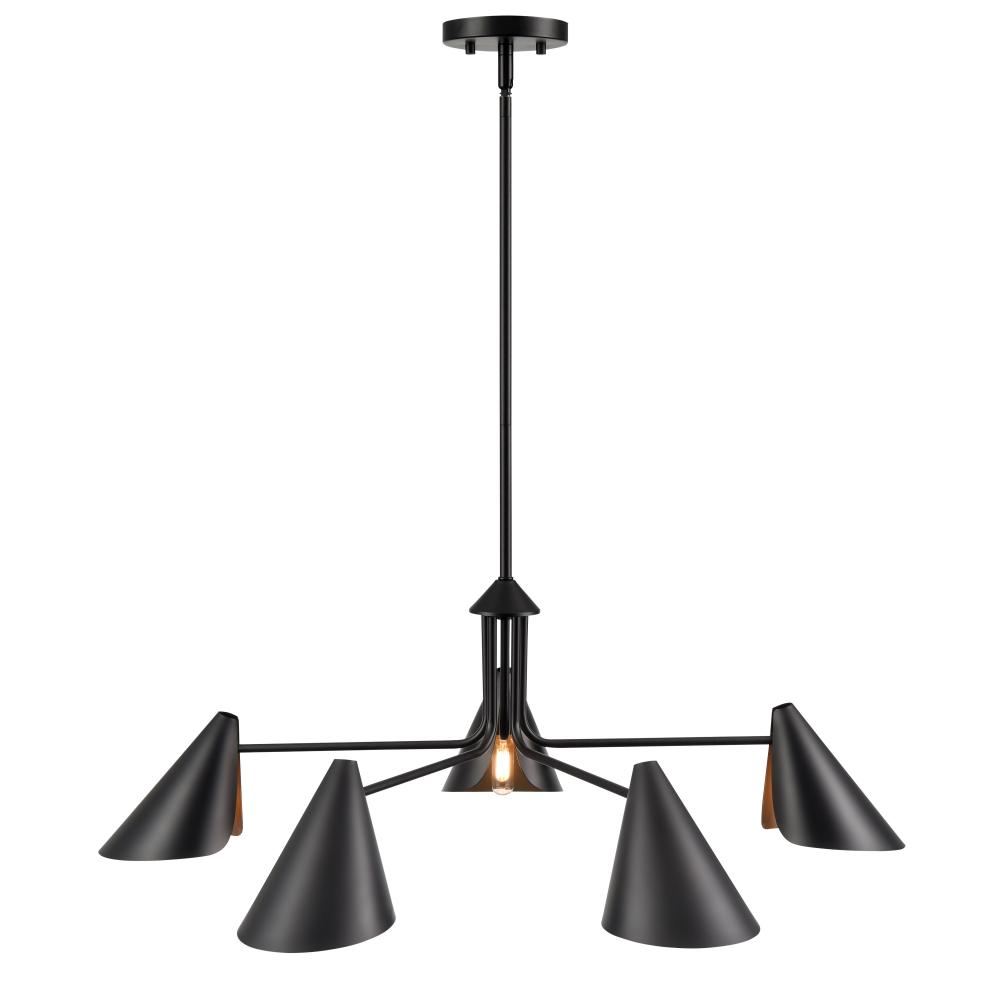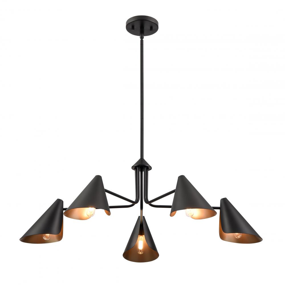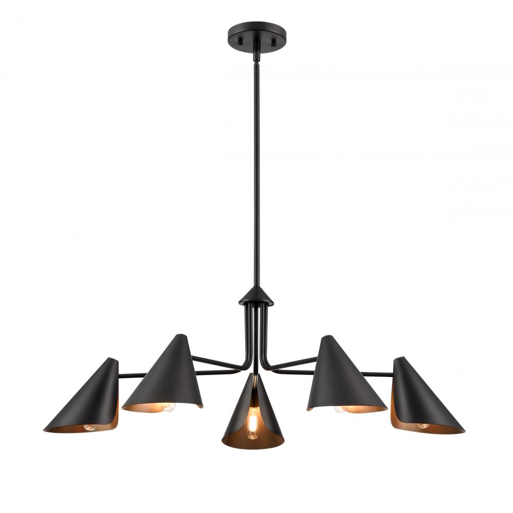 Dynamic design and crisp lines give the Warhol Collection of chandeliers a look of distinction that will become a striking focal point for any room. The fixtures are finished in matte black and are available in either 4-light or 6-light options. The mid-century shades fold open towards the fixture's center and are completed with a gold interior, providing a warm and intimate light.