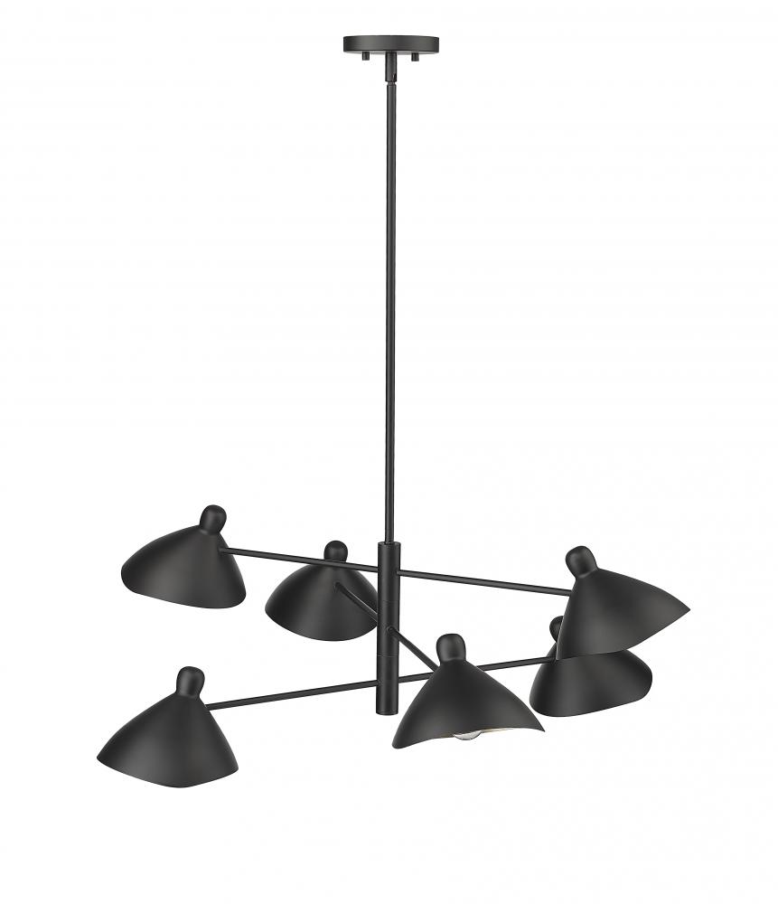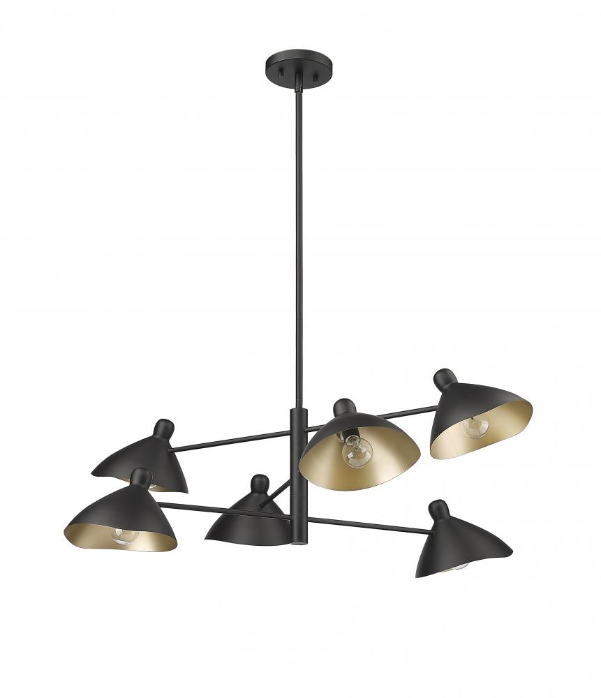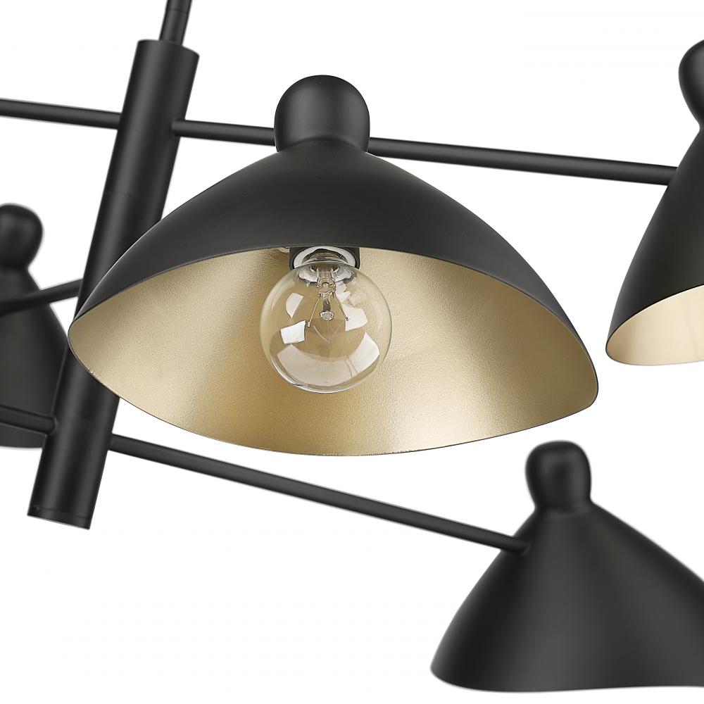 Dynamic design and crisp lines give the Warhol Collection of chandeliers a look of distinction that will become a striking focal point for any room. The fixtures are finished in matte black and are available in either 4-light or 6-light options. The mid-century shades fold open towards the fixture's center and are completed with a gold interior, providing a warm and intimate light.