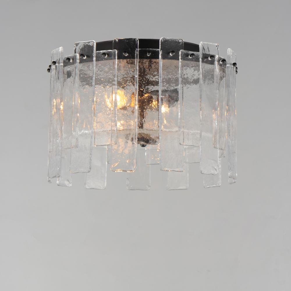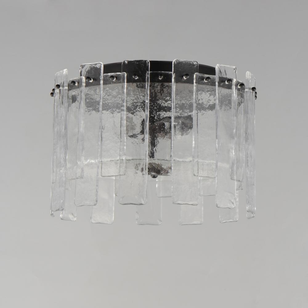 Gracefully flowing molten glass panels with uniquely organic aesthetic encircle rings of rich Darkened Bronze metal or hand-applied Gold Leaf. This refined interpretation of tiered glass pendants exudes warmth and elegance, effortlessly blending a moody am