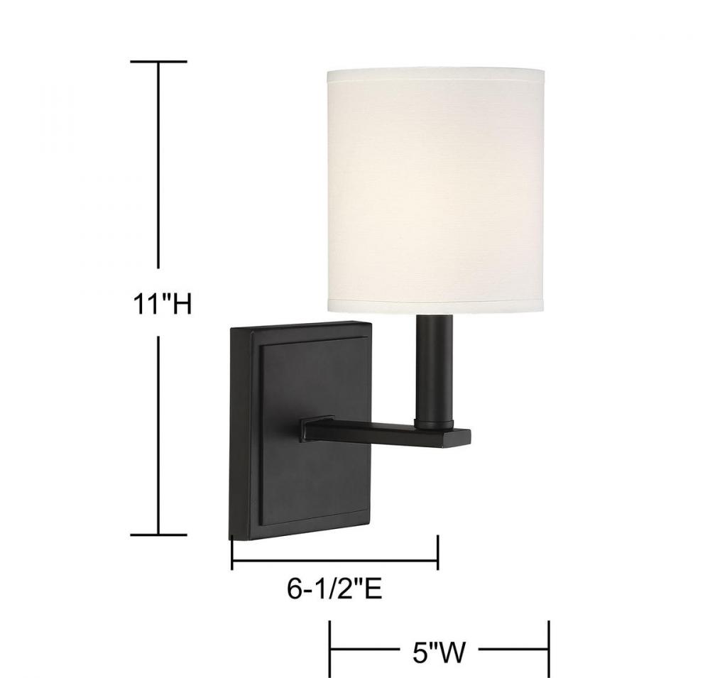 Chic and contemporary! The Waverly wall sconce is a sleek fixture to add a beautiful, polished layer of light to your home’s overall interior lighting design. Plus, the clean lines and soft glow create a subtle and serene mood. The frame has an outlined square wall plate and a bold L-shaped light arm with a matte black finish. A streamlined, cylindrical white shade encloses one 60W candelabra size bulb for lovely, glare-free illumination. The Waverly’s elegance blends well with many decor styles, such as modern, farmhouse and transitional. Measuring 5" wide and 11" high and extending 6.5" from the wall, it's an ideal fit for a bathroom, bedroom, dining area, living room, kitchen, family room, foyer, media room, office or hallway.