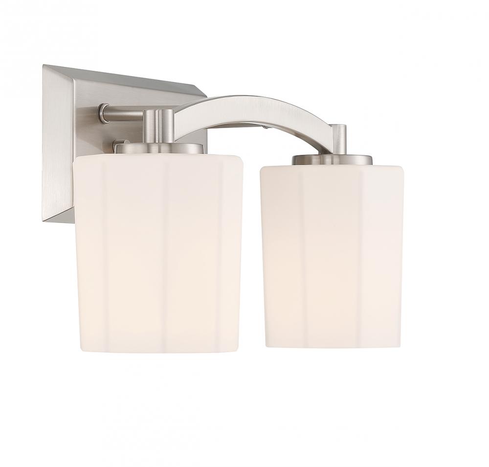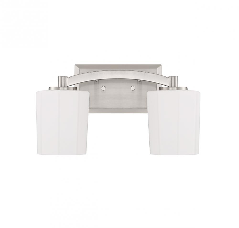 Get understated glamour for the bathroom with this Savoy House Whitney 2-light bath vanity light. Fluted shades of opal etched glass offer up a flattering glow, the curving arm adds intrigue and the satin nickel finish adds versatility. Whitney is 8" in height, 14" in width and extends 6.5" from the wall. It uses two standard size bulbs of up to 60 watts per bulb (bulbs not included).