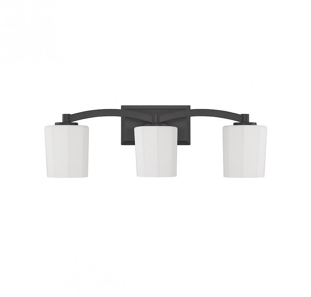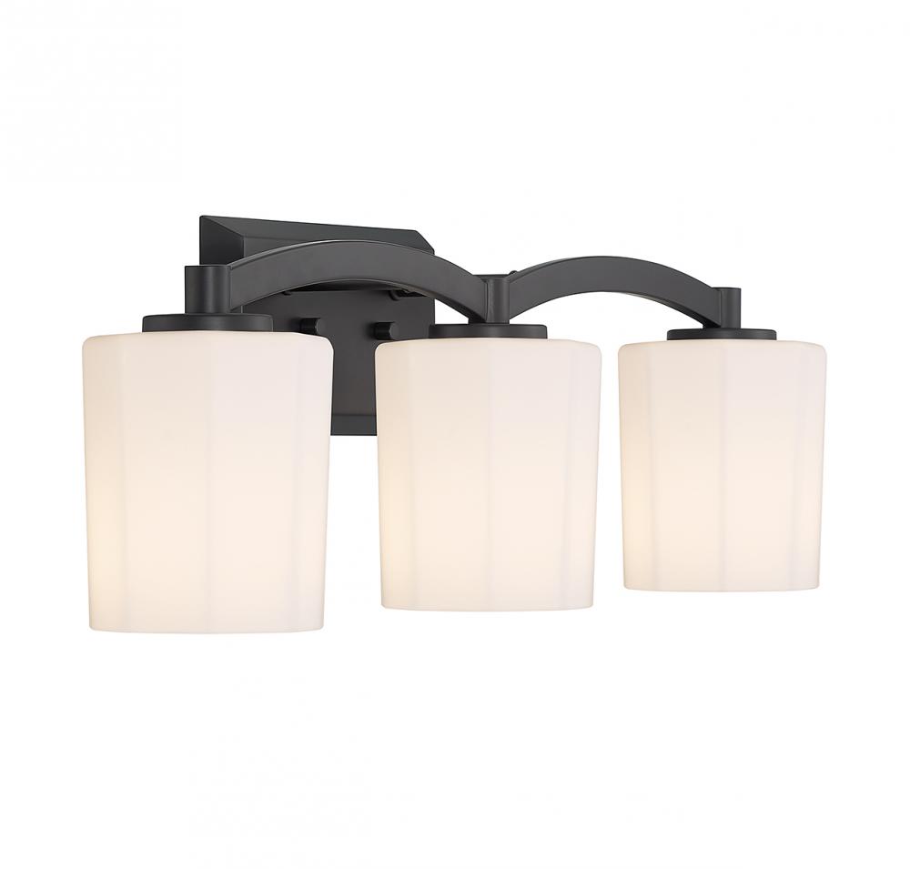 Get understated glamour for the bathroom with this Savoy House Whitney 3-light bath vanity light. Fluted shades of opal etched glass offer up a flattering glow, the curving arm adds intrigue and the matte black finish adds versatility. Whitney is 8" in height, 24" in width and extends 6.5" from the wall. It uses three standard size bulbs of up to 60 watts per bulb (bulbs not included).