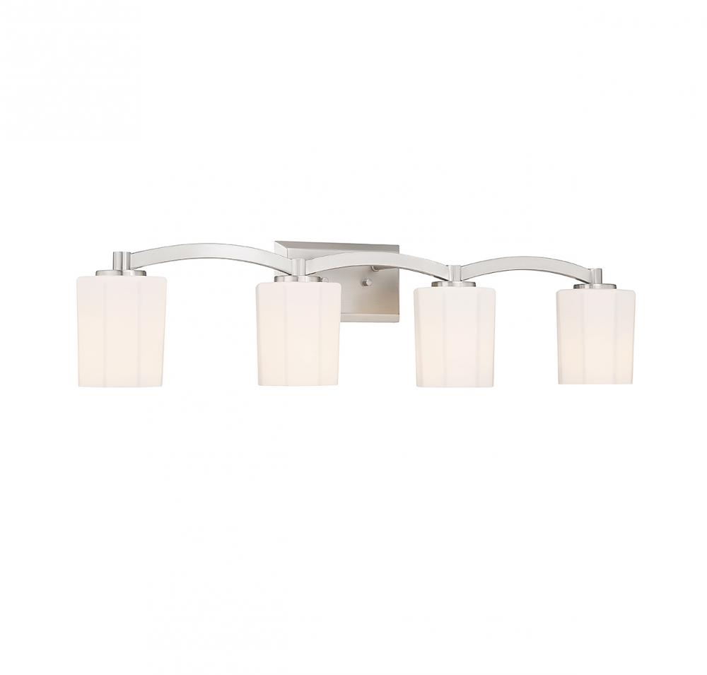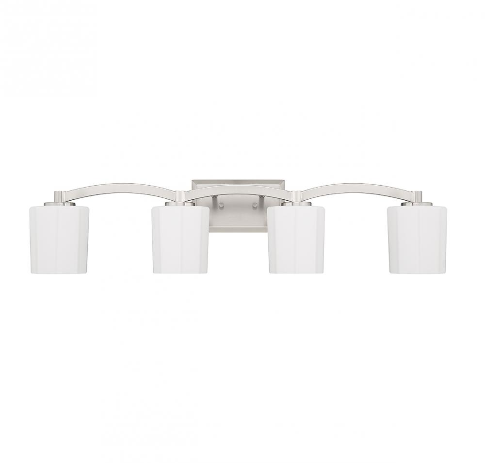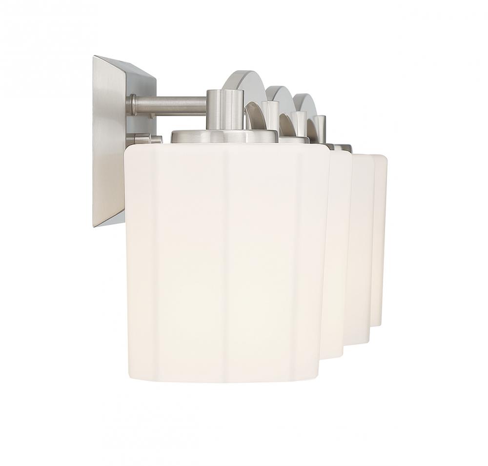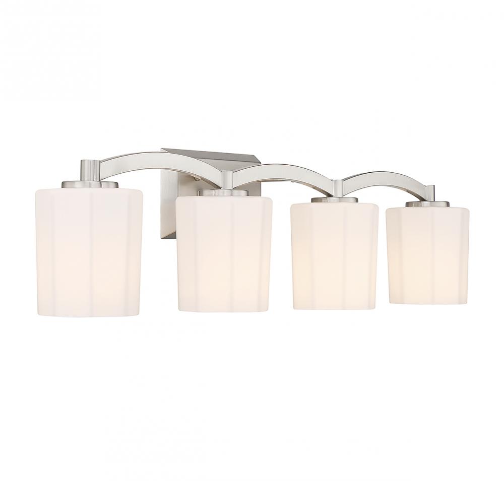 Get understated glamour for the bathroom with this Savoy House Whitney 4-light bath vanity light. Fluted shades of opal etched glass offer up a flattering glow, the curving arm adds intrigue and the satin nickel finish adds versatility. Whitney is 8" in height, 33" in width and extends 6.5" from the wall. It uses four standard size bulbs of up to 60 watts per bulb (bulbs not included).
