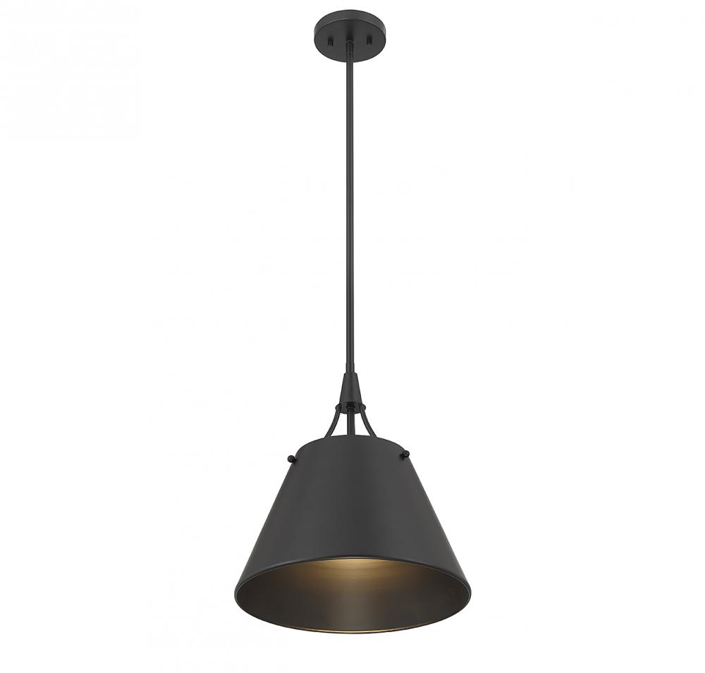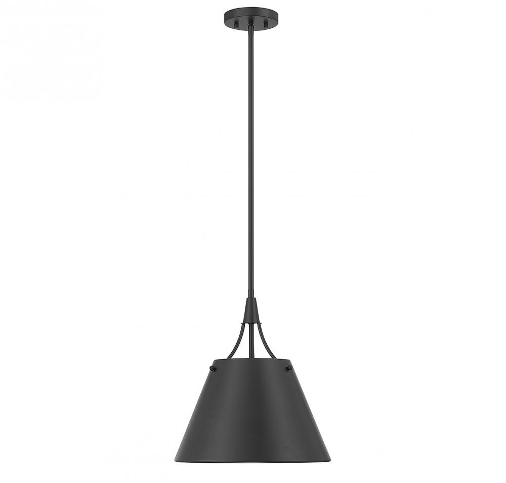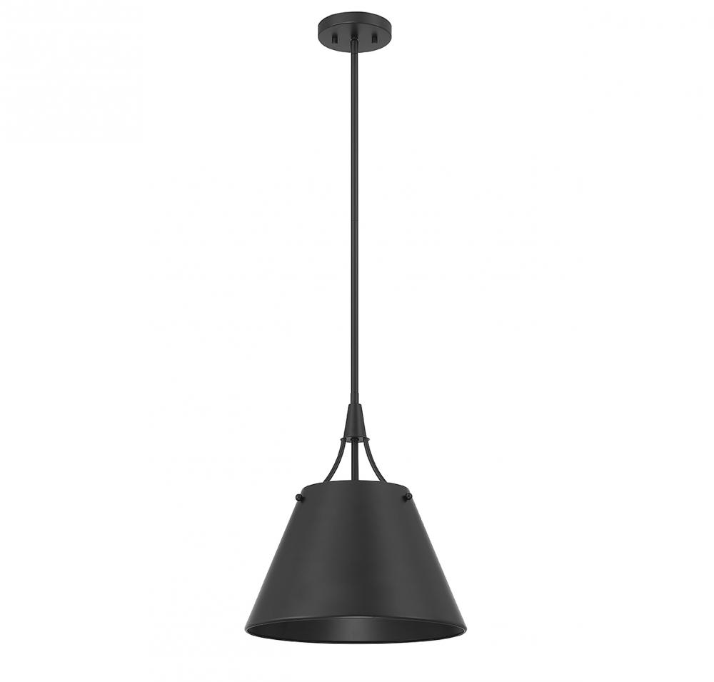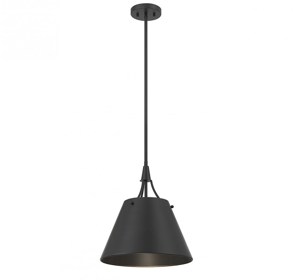 The Savoy House Willis 1-light pendant has an elegant look with a solid metal shade finished in matte black. Perfect for use solo or in groupings! Willis is 14" in width and has an adjustable height ranging from 16" to 69.5". Comes with four 12" downrods and one 6" downrod. It uses 1 standard size bulb with a max of 60 watts (bulb not included).